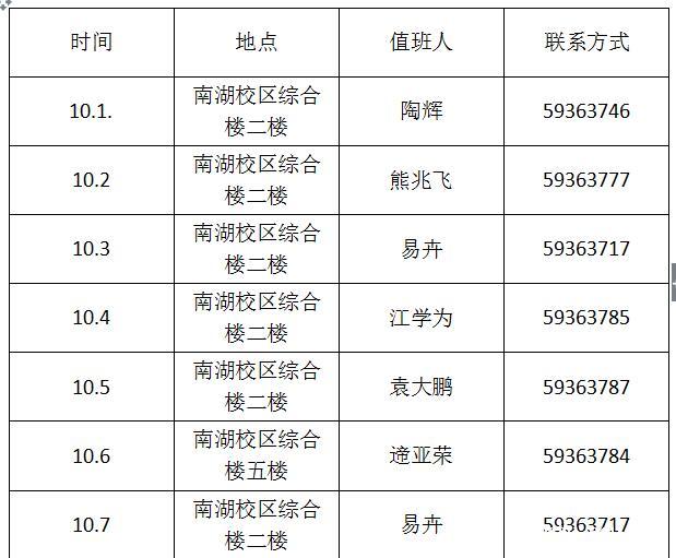 根据学校十一假期安排通知,学院假期值班安排如下: