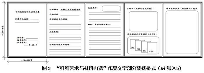 C. 纤维艺术与材料再造——必须是原创实物作品,并提供作品文字图解说明(排版格式参考图3),主题明确,结构形态和色牢度稳定。实物作品整体尺寸为:长×宽≤45cm×30cm,可以加框装裱,但不能加玻璃镜面。