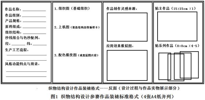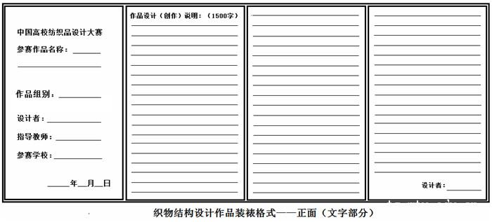 A.织物结构设计与小样试织——主作品大小15cm×15cm;同一结构品种不同花色规格系列化作品大小8cm×8cm,不少于3只,以两张黑色A3(29.7cm×42cm)卡纸(即4张A4纸并列)统一装裱(装裱格式见附图1),尺寸和装裱如不符标准,将不予受理。同时附1500字左右的白色A4纸打印“设计(技术)说明”文字稿(四号字,宋体,单倍行距,科技论文格式)裁边后贴于正面(如图1的“正面”所示),详细说明作品的设计创作意图、材料组合、结构风格特征、生产工艺技术特点、染整后处理要求和主要用途、适用区域和消费者对象等,但是不能出现作者及其所在学校等的任何信息。