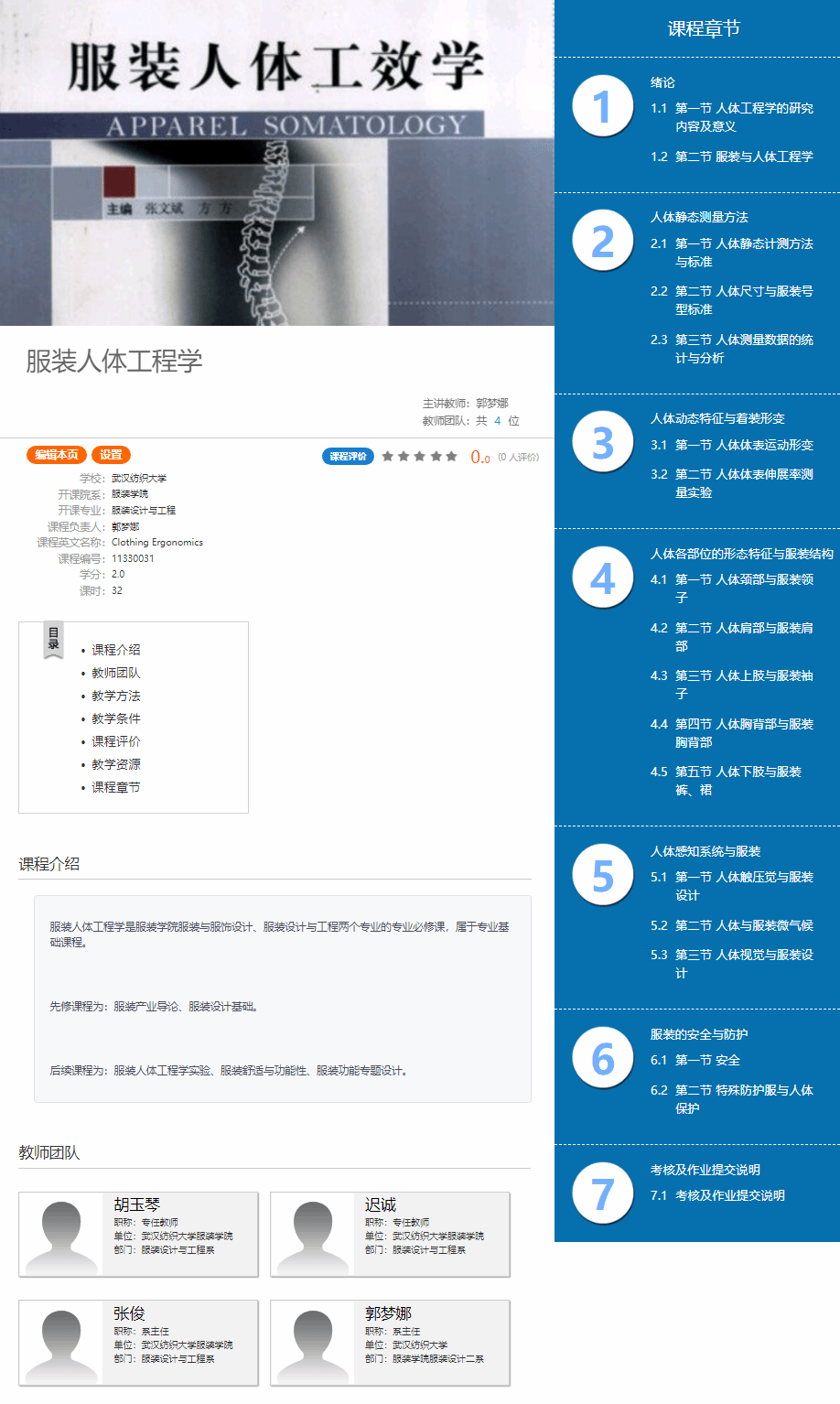 《服装人体工程学》为国家级一流专业服装与服饰设计、省级一流专业服装设计与工程两个专业的必修课。2020年,课程负责人录制了《服装人体工程学》课程SPOC视频,2021年通过完善和优化,覆盖课程章节达到100%,并正式采用混合式教学。2023年获批百合小说