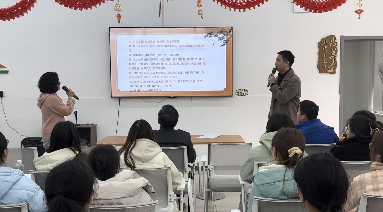 紧接着,唐家诚分享了他在寒假期间深入学习《大学》的收获,他表示,通过寒假期间的《大学》诵读学习,让他对“修身”有了更深的理解,《大学》中强调的‘修身’不仅是个人品德的修养,更是对自我要求的不断提升,只有不断提升自己的专业素养和道德修养,才能在未来的职业生涯中走得更远,”他鼓励同学们在学习专业知识的同时,多读经典,从传统文化中汲取智慧,提升自己的综合素质。