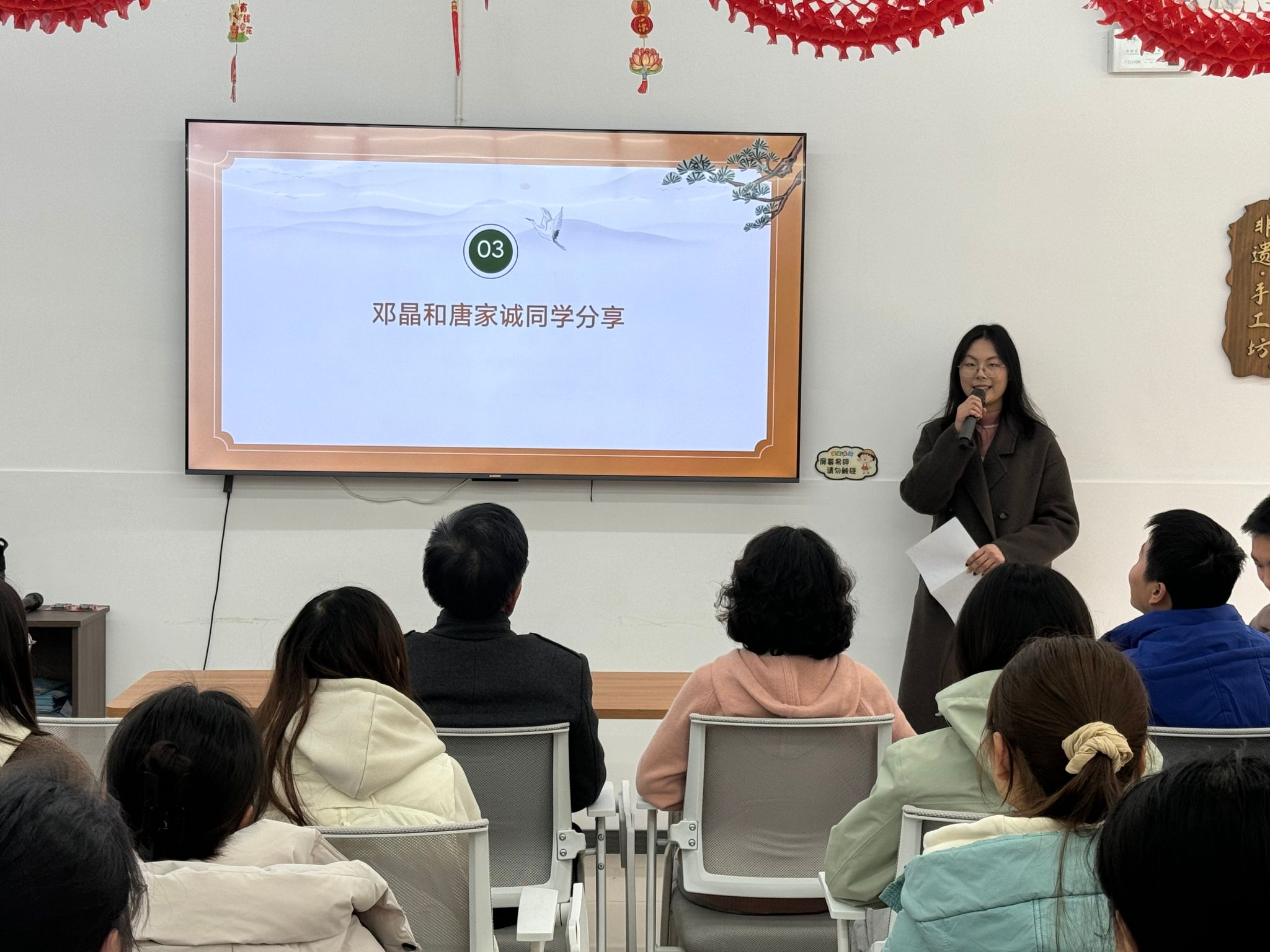 在心得分享环节,学生代表邓晶、唐家诚结合自身成长经历,从青春视角解读经典内涵。邓晶首先分享了她对《大学》的理解与感悟。她提到,作为一名大学生,自己在学习《大学》的过程中,深刻体会到了“修身、齐家、治国、平天下”这一儒家思想的递进关系。她认为,经典不仅仅是古代圣贤的智慧结晶,更是当代青年在成长过程中不可或缺的精神指引,邓晶结合自己的学习生活,谈到在面对学业压力和人生选择时,正是《大学》中“格物致知、诚意正心”的理念帮助她找到了内心的平静与方向。她表示:“经典不仅是历史的回响,更应成为指引当代青年价值观的明灯。