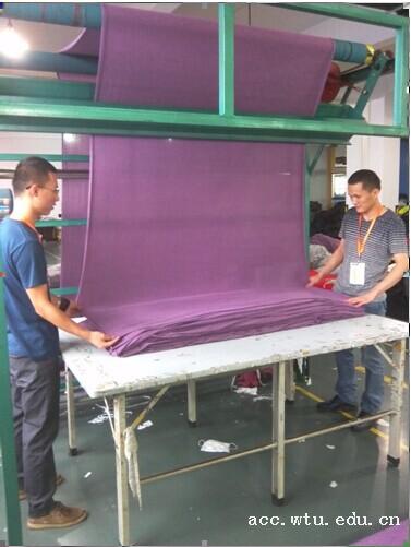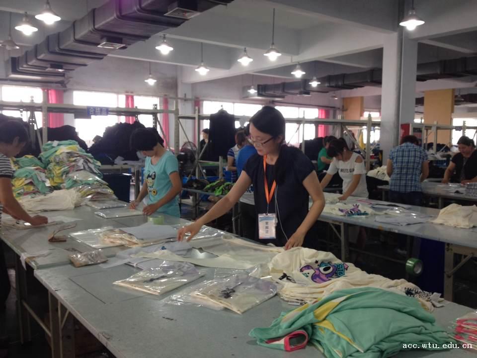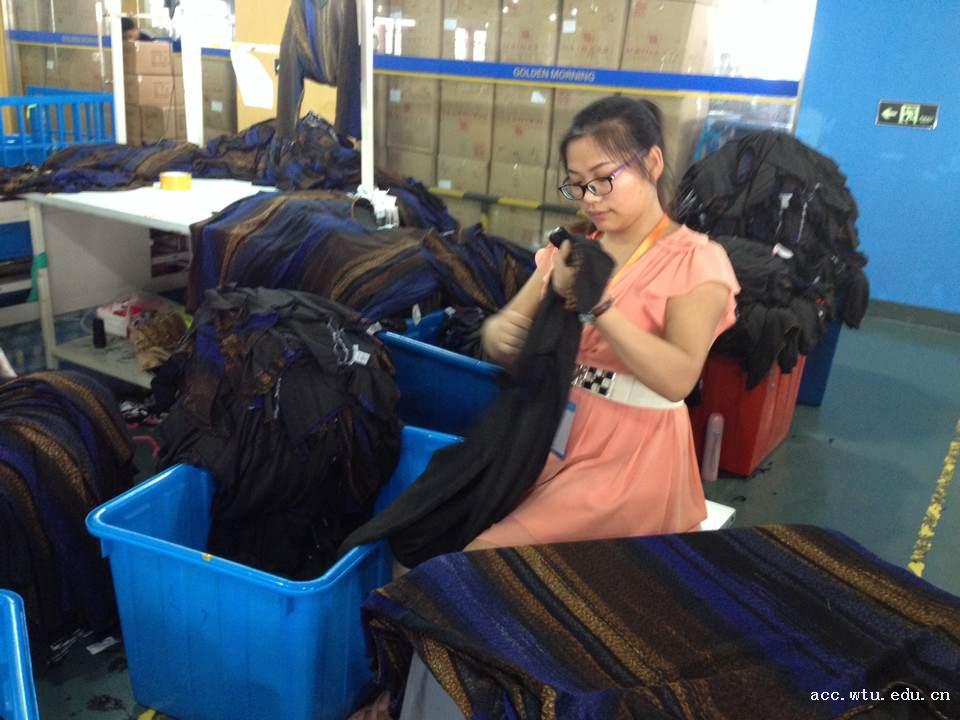 在江苏金辰针纺织有限公司的服装生产车间,同学们协助企业职工完成服装裁剪、缝制、后整理等相关工作,并在完成相应工作的同时不断自主深入了解企业,发现问题并思考解决方法。通过实习考察,服工专业胡彩云同学在做服装检测工作的过程中发现,以前书本上学到的知识已不能满足现代工业化生产的要求,针对不同的客户、不同的衣料材质,需要有不同的检测方式。在实际的操作过程中,同学们也发现了生产中存在的一些问题,例如生产产量无法保持稳定,导致工厂经常出现加紧赶工现象等,并提出加大管理力度、提高人员专业素质等解决方法。