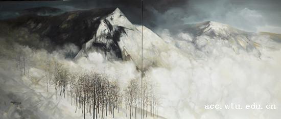 周教授的的山水作品将人们带入一种至真纯美的艺术境界中,使人们在感悟山水形象的过程中,实现精神的超越。其山水作品,多见天地一色,一峰兀起,独立苍穹的景象,它们都有一种刺破苍穹的力量,有着孤傲的风骨。周教授的山水作品看似是通常意义上的“风景”,实则是中国绘画的生命观念及精神境界的表达。他笔下纯净的黑白之境,不能单纯以概括提炼的艺术手法去说明,而应结合中国文化的思想观念加以辨析。尽管他采用了油画的媒材书写山水之象,但是画面中用笔、用色的点、染、皴、擦,以及恣情纵意的表现等,同样传递出水墨画的笔墨韵味。