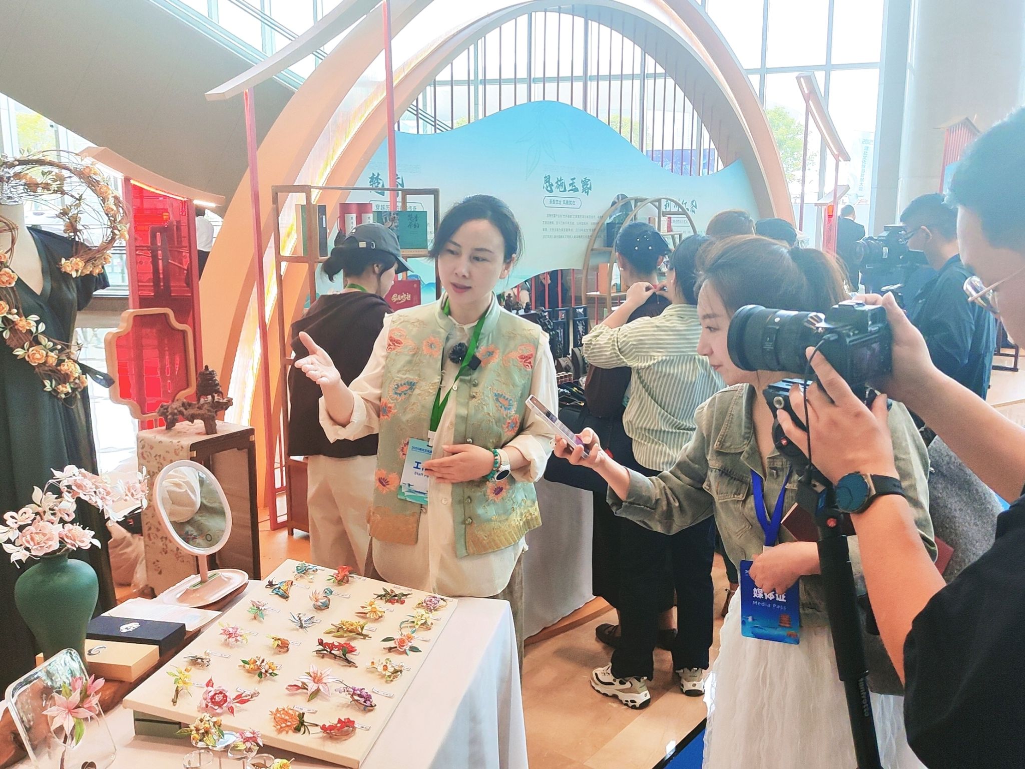 同时,将中国传统二十四节气与花卉造型结合,通过桑蚕丝线缠绕出各式立体线艺,制成精美胸针,展现非遗技艺“小、巧、精、活”的特点。参展人员震惊之余不忘表达:“节气胸针把文化记忆变成可佩戴的诗意,传统工艺原来可以这么年轻。”