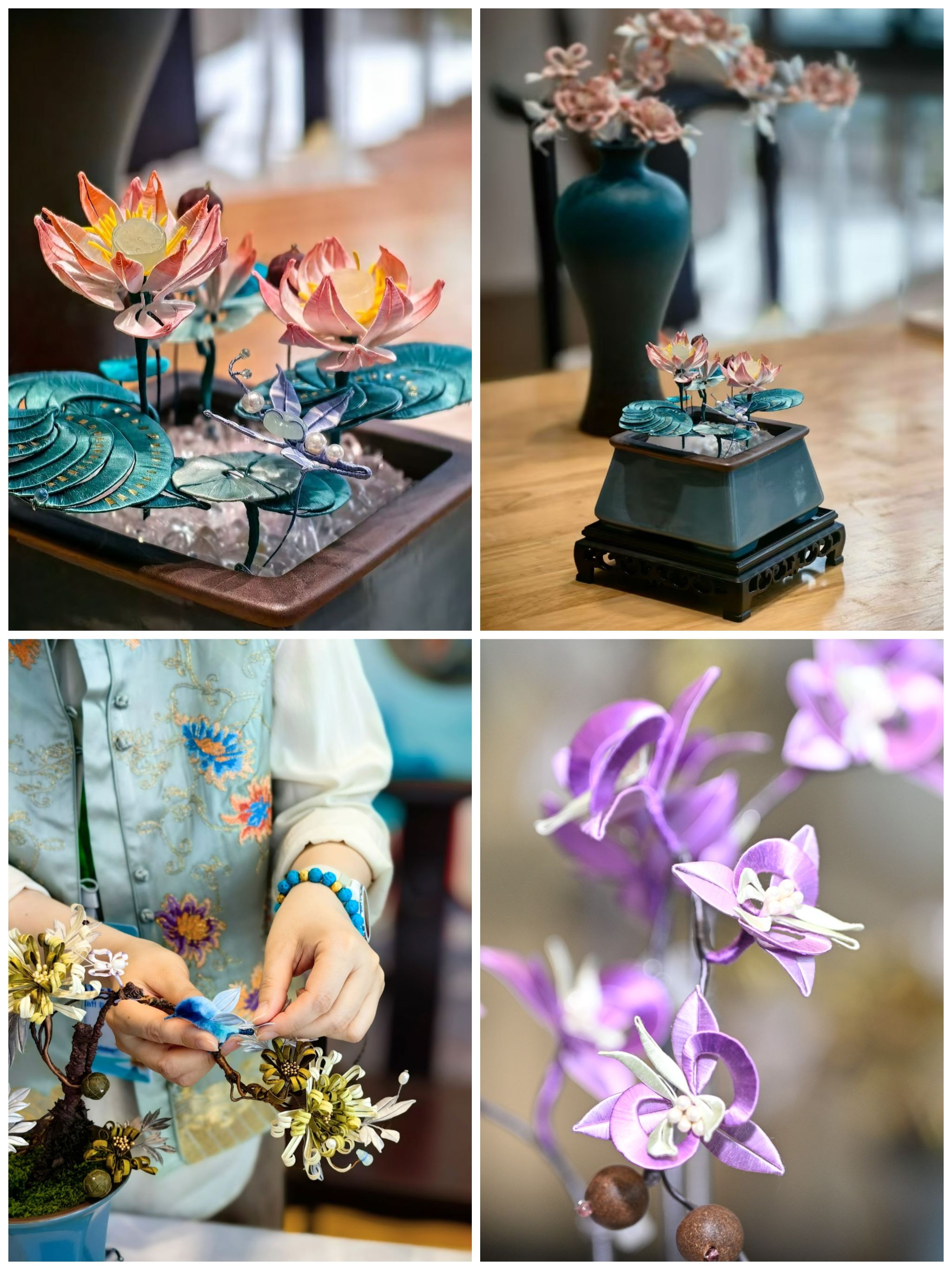 以铜丝为骨架,丝线缠绕成型,将花卉形态凝固定格,结合素陶花器,呈现东方美学意境,打造“永不凋谢”的中式雅韵。