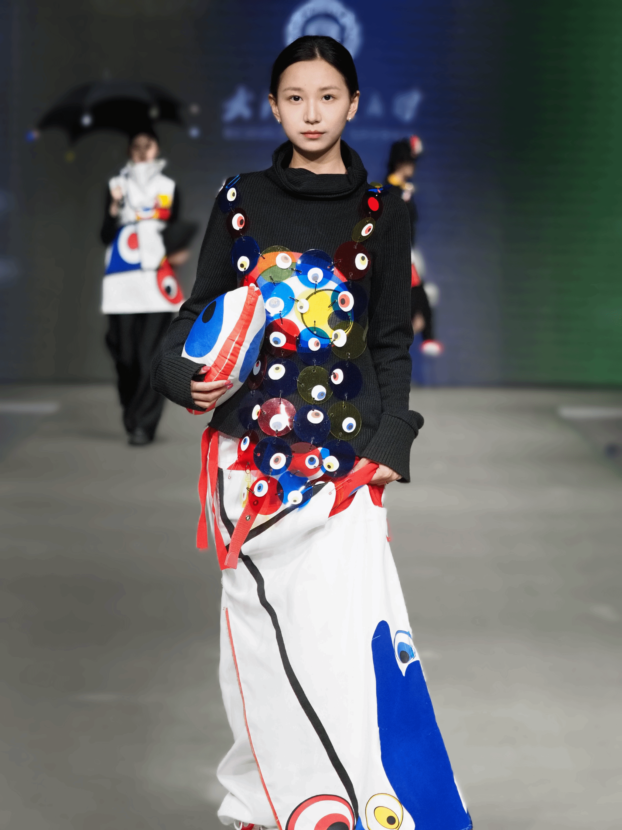 学子带来的毕业设计作品动态展演。此次展演的作品来自于2025“焕•化”时装周的优秀成果,通过时尚与设计的独特视角,探寻科技之光,焕新生活态度,全面展现年轻设计师的创新精神与风采。