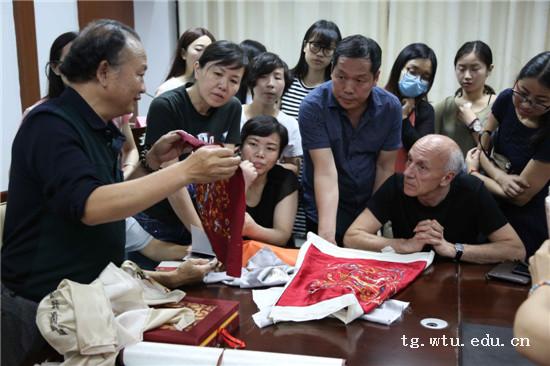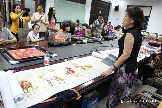 在此次培训中,湖北省40多名纺织类非物质文化遗产代表性传承人参加了培训。其中我校非遗研究中心主要从传荆楚地区纺织文化遗产的基本特征,色彩艺术搭配与运用,传统图案的设计与应用,传承与创新,产品设计与市场营销,传统与现代融合、继承与发展并重、形象与礼仪等内容对传承人进行了培训和指导。培训之余,包括汉绣、英山缠花、黄梅挑花、鄂西苗族刺绣,土家西兰卡普、枝江布鞋等非遗项目传承人现场秀拿手绝活,切磋技艺。期间,参观了武汉市博物馆的刺绣精品展。