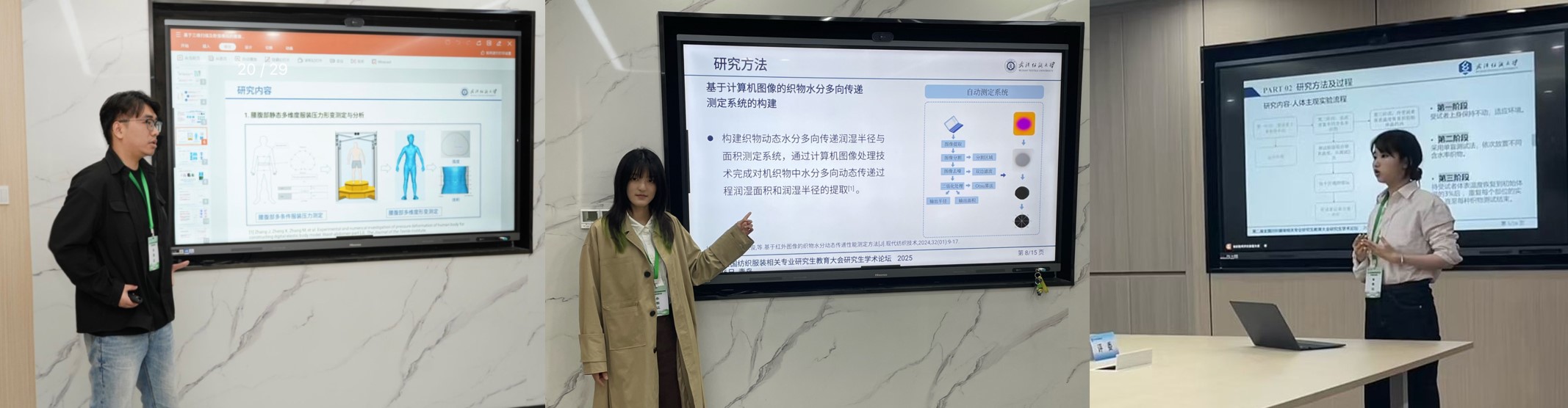 在大会期间举办的研究生学术论坛中,我院有3个研究生项目入围论坛口头报告,分别为郑兴 “基于三维扫描及数值模拟的腰腹部服装压力形变多模态分析”,石雨青 “基于红外图像的织物动态水分传递性能的测定与分析”和屈微雅 “人体分区热湿舒适感知实验评价”,三位同学分别进行了口头报告与交流。此外,彭琳、罗哲熙、吴程欢和杨越四位研究生参加了墙报展示。