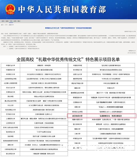 积极申报,党委宣传部主动沟通协调推介。此次活动共评选出全国高校“礼敬中华优秀传统文化”示范项目10项、特色展示项目50项。《弘扬荆楚文化 传承汉绣技艺》的获批意味着学校特色校园文化建设得到了国家乃至社会各界的广泛认可。