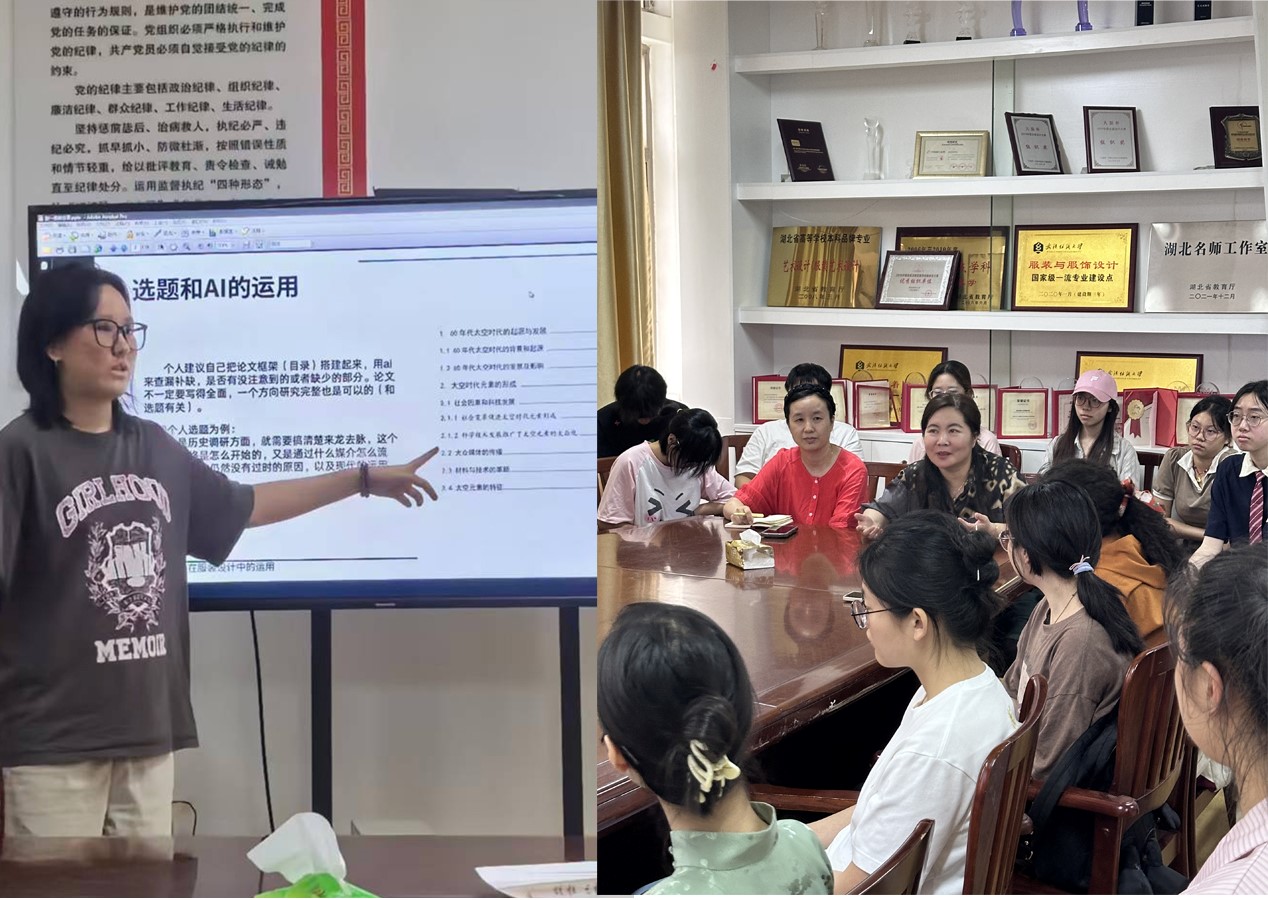 服设12101班的彭一同学,首先跟大家介绍了她的毕业设计主题,从灵感来源都思维发散、设计构思等环节进行了生动讲解。特别提到,希望学弟学妹们能理性有效使用AI工具助力论文写作。以她自己的亲身经历实践告诉大家,AI只是辅助工具,论文的核心还是我们自己的思想。在讲述毕业设计环节时提到如何把握具有较高市场潜力的成衣设计要点,以及如何进行局部面改装饰细节要素。