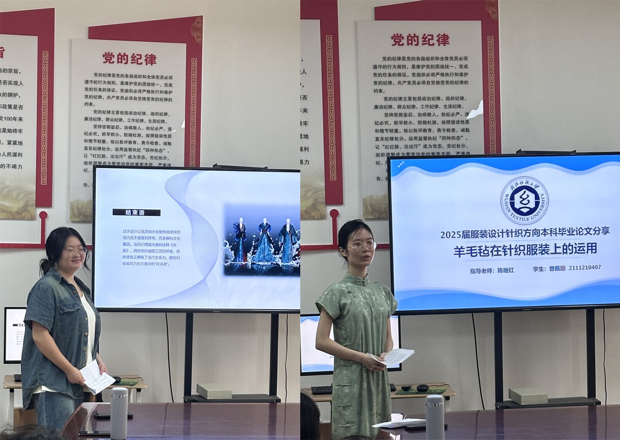 针织12101班的曾佩珊同学,分享了她的选题背景与思考,是如何想到将羊毛毡运用与针织服装设计中的。四套针织服装的制作完全是由自己手工独立完成,从选线到针织指导再到编织缝合以及毛毡手工,同时结合新型发光材料增加服装的趣味性。最后分享了毕业论文写作的经验总结,如何定目录定框架,每个章节的逻辑关系等。