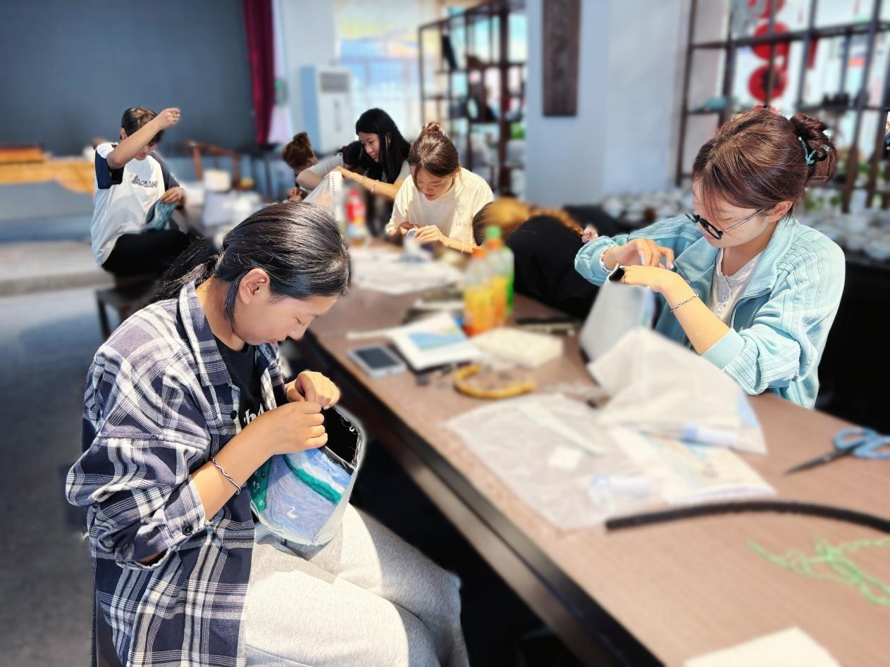 培训班学员由博尔塔拉职业技术学院24名师生及6位本地手工爱好者组成。怀着对传统技艺的热爱,他们在纺大非遗中心专家的悉心指导下,系统学习了针毡工艺与汉绣特色针法,并围绕赛里木湖主题进行创意设计实践。课堂上,学员们专注实操,交流热烈,学习氛围浓厚。结业后,学员作品在博州大巴扎和赛里木湖景区展出销售,广受游客青睐。