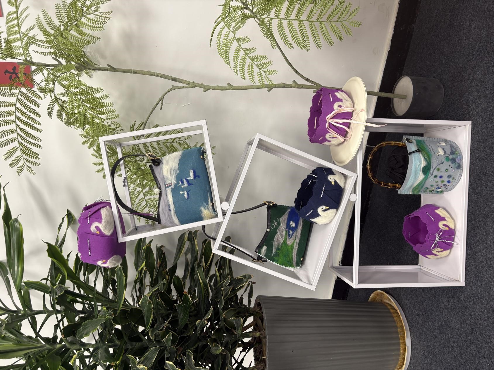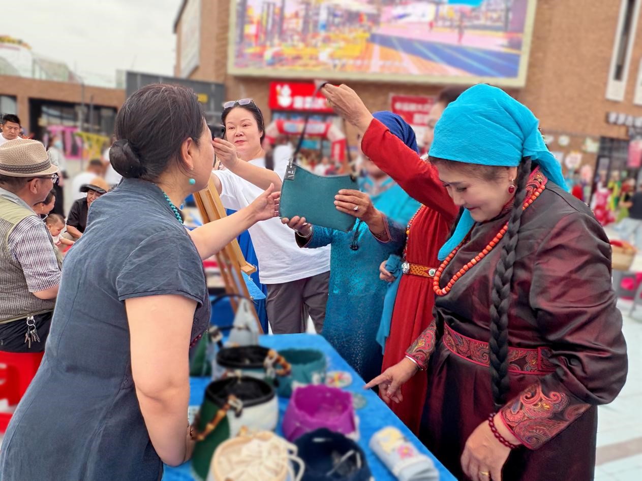 结业成果展上,60余件融合创新作品惊艳亮相,涵盖包袋、收纳盒、纸巾盒、化妆包等生活美学产品。其中,汉绣针法生动再现了赛里木湖的粼粼波光,毛毡的粗犷质感则完美诠释了草原的辽阔苍茫,每一件作品都诉说着鄂博两地传统手工艺交融共生的独特魅力。