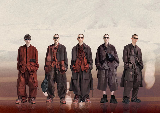 杨诗琳的《钢城旧影》系列男装,巧妙运用武汉钢城建筑的剪影拼布工艺,与香云纱面料交织出独特的纹理。在聚光灯的映照下,这一系列作品不仅展现了工业遗产的焕新重生,更深刻体现了一代青年设计师对“可持续时尚”理念的坚定践行。