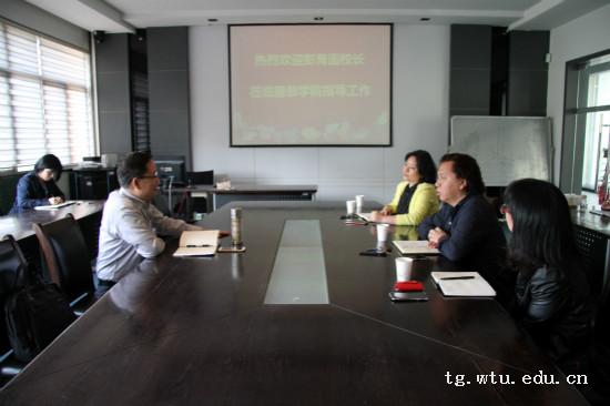 调研指导工作,听取学院领导班子成员汇报,并与学院各系部主任、骨干教师亲切座谈。期间,彭校长在我院党政领导的陪同下,到综合楼教师工作室、中日班教室等处进行了实地察看和现场指导。