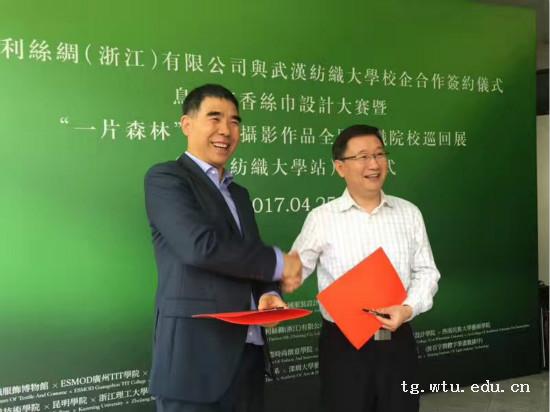 4月25日上午,我校与达利丝绸(浙江)有限公司校企合作签约仪式在南湖校区图书馆隆重举行,同时,由达利丝绸赞助的“鸟语花香”丝巾设计大赛暨“一片森林”林平摄影作品全国纺织院校巡回展正式开幕,达利丝绸(浙江)有限公司董事长林平、百合小说