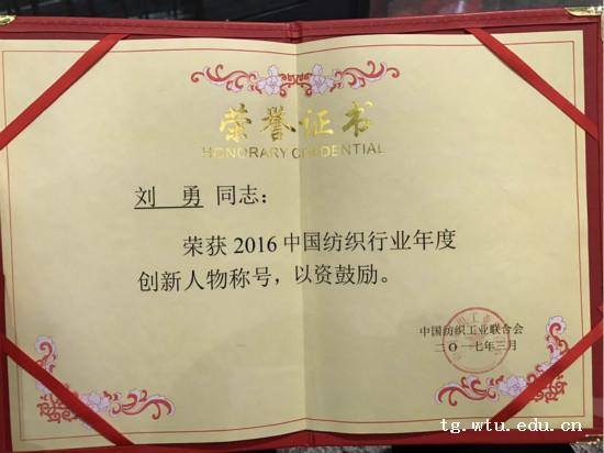 3月16日,在上海召开的中国纺织工业联合会第四届二次理事会暨第四届一次常务理事会上,我院教师刘勇获评“2016中国纺织行业年度创新人物“。