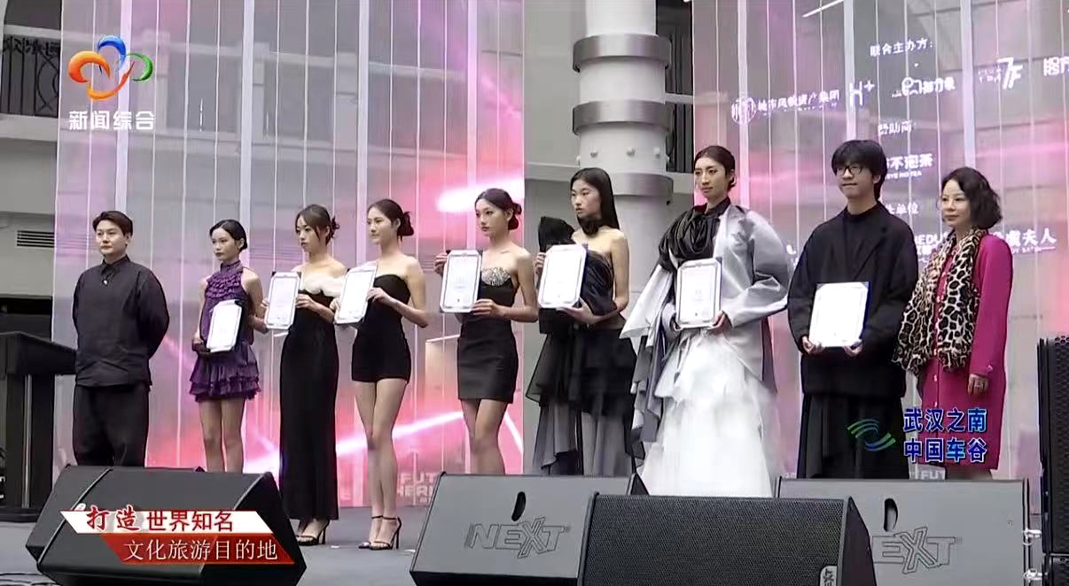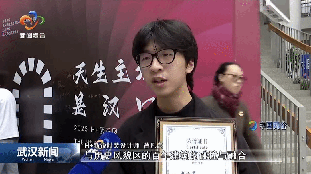 近日,我院2023级时尚品牌管理专业学生曾凡宸同学凭借服装设计作品《我见青山》,在“天生主场是汉口”2025年度H+武汉风貌旅行指南颁奖典礼暨H+青年时尚盛典中,荣获“新锐服装设计师奖”,并接受武汉新闻采访。