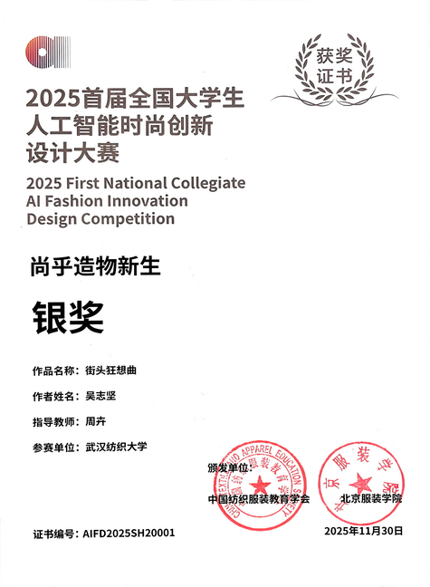吴志坚接受采访时说道:“每一次比赛获奖都离不开学院的悉心栽培,还有周卉老师的指导、鼓励和支持,我非常荣幸能在此次大赛中获奖。对于此次比赛过程中的体会,我认为人工智能正为服装设计带来一场深刻的变革。它如同不知疲倦的创意伙伴,能高效处理数据、生成海量视觉方案,极大拓展了我们的想象边界,让设计师能更专注于概念深化与情感表达。此次获奖作品正是人机协同的探索——AI提供了超越常规的结构与图案可能,而我负责将其转化为可穿着的情感表达。未来,我们以创意为舵,驾驭AI的技术之舟,共同探索时尚设计的全新可能,让科技服务于美,让设计更具前瞻性与人文关怀。