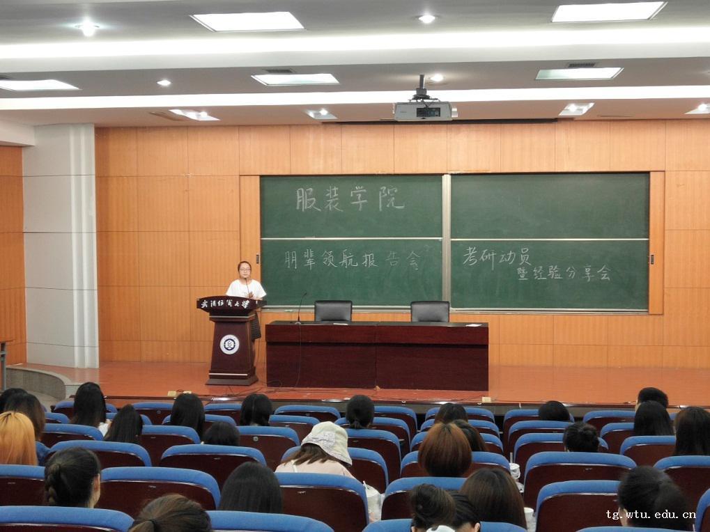 针织服装研究专业的陈琛学姐。学姐向大家介绍了北服的考试内容。学姐说,不用担心学校好不好考、学校录取率的问题,要专心努力复习到最好的状态迎面而上。多看课本,自己总结知识点整理思路,不要一位背学姐学长整理的所谓的重点。多向学长学姐请教一下考研的经验。学姐建议大家合理安排复习时间,做一个复习时间表,有目的的复习。学姐还特别介绍了一种复习小技巧:将知识重点录音,把录音当歌听。学姐希望大家都可以坚持,心态放轻松。她送给大家一句一直激励她的话“不逼一下自己你永远不知道自己有多优秀”。