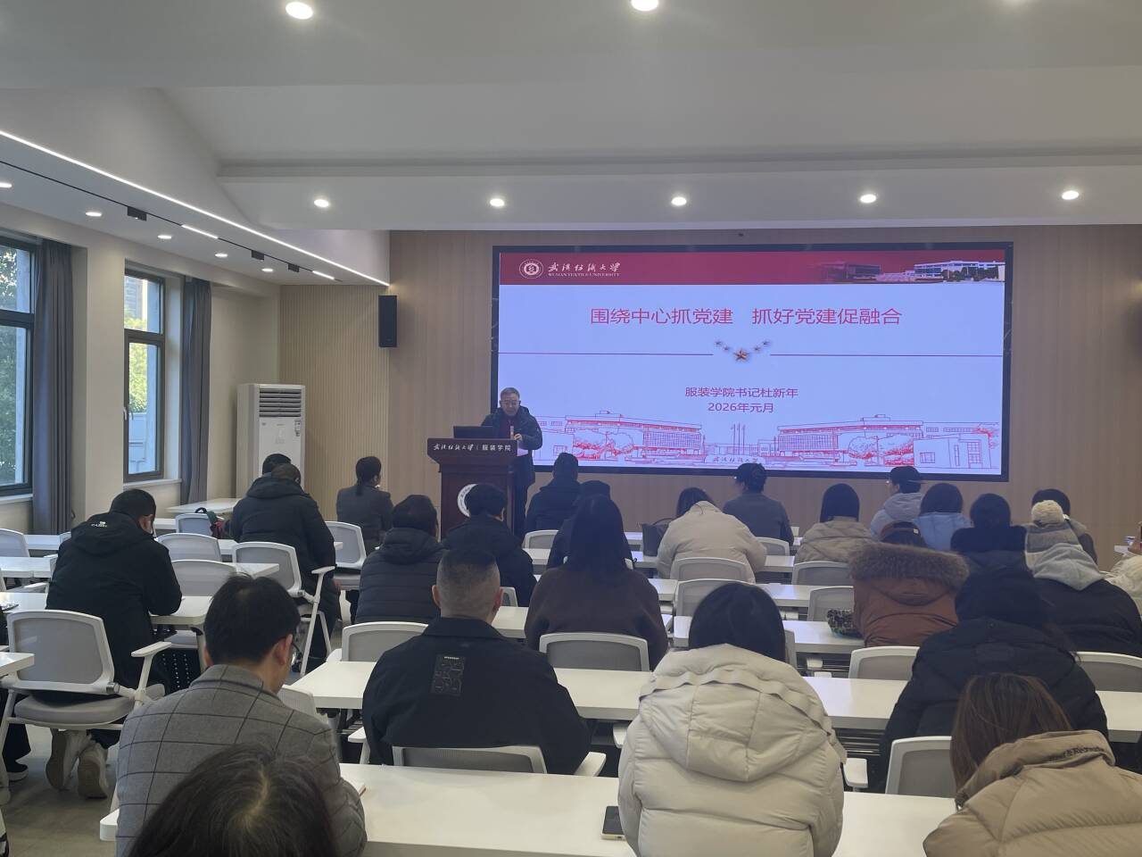 院党委书记杜新年以 "围绕中心抓党建,抓好党建促融合" 为题作述职报告。他从深化党建引领、强化思想武装、夯实组织基础、锤炼优良作风、推进党风廉政建设五个方面,系统梳理了 2025 年党建工作成效,客观分析了当前在理论学习深度和广度上存在的不足,并针对性地提出了下一步改进措施,强调将持续推动党建与学院业务工作深度融合、同频共振。