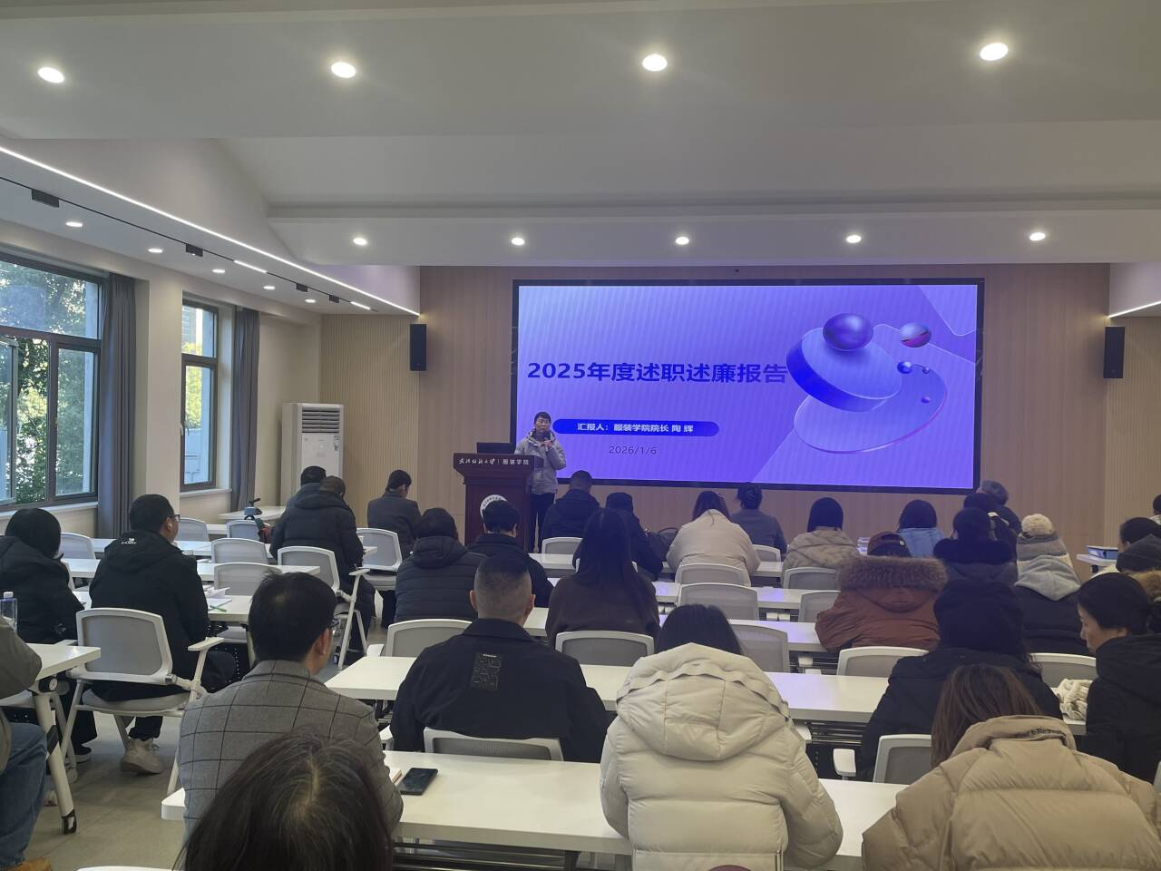 院长陶辉聚焦 "强固优势、彰显特色、加强交叉、数智赋能" 主线,全面回顾了 2025 年学院在学科建设、人才培养、科研创新、国际合作、招生就业等重点工作取得的进展。同时,她直面当前存在的学科交叉融合不够深入、科研基金质量有待提升、专业改革力度需进一步加大、国际化覆盖范围不足、就业指导精准度欠缺等问题,详细阐述了2026年工作计划,并就自身履行党风廉政建设责任制情况进行了深入剖析。