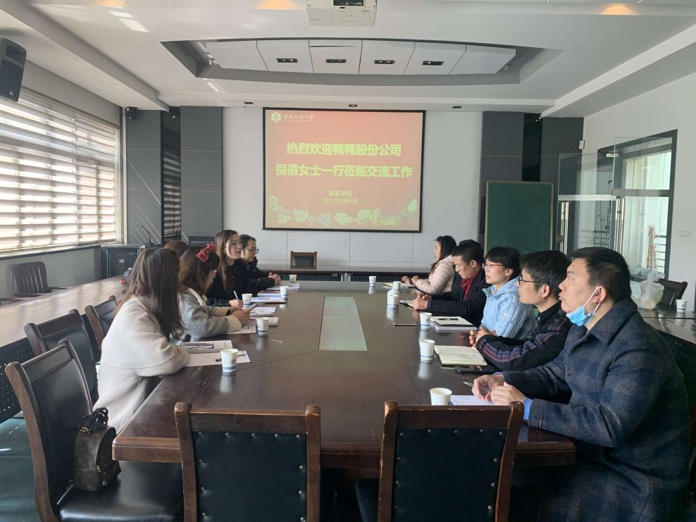 陶辉院长代表学院对倪总一行表示热烈欢迎,并就学院的办学历史和特点、师资队伍建设、学生人才培养、国际交流与合作等相关情况进行了介绍,并希望双方在深入沟通和交流的基础上加强校企合作,进一步整合资源、互惠互利,实现发展共赢;倪蓓总监介绍了鸭鸭股份公司近些年转型发展的情况,同时希望未来在品牌提升、产品开发、人才招聘等方面与学院开展更深入的交流和合作。