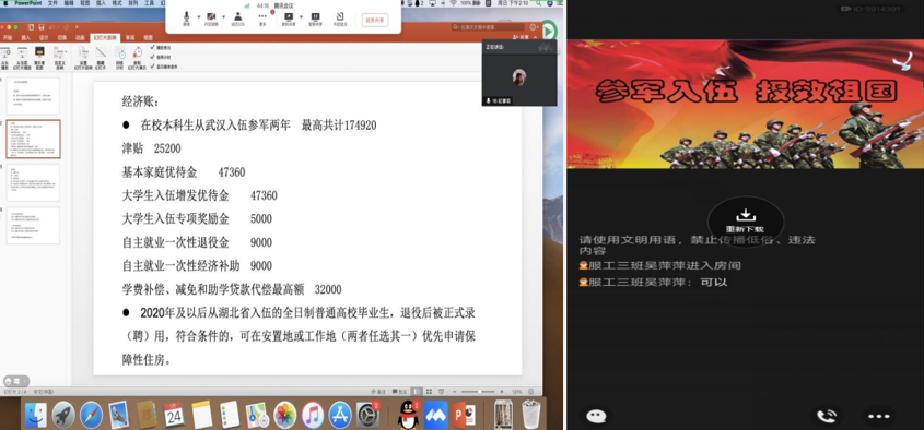 各年级辅导员利用假期,梳理征兵的相关要求和优惠政策,于近期举办了关于征兵政策宣讲的线上会议。