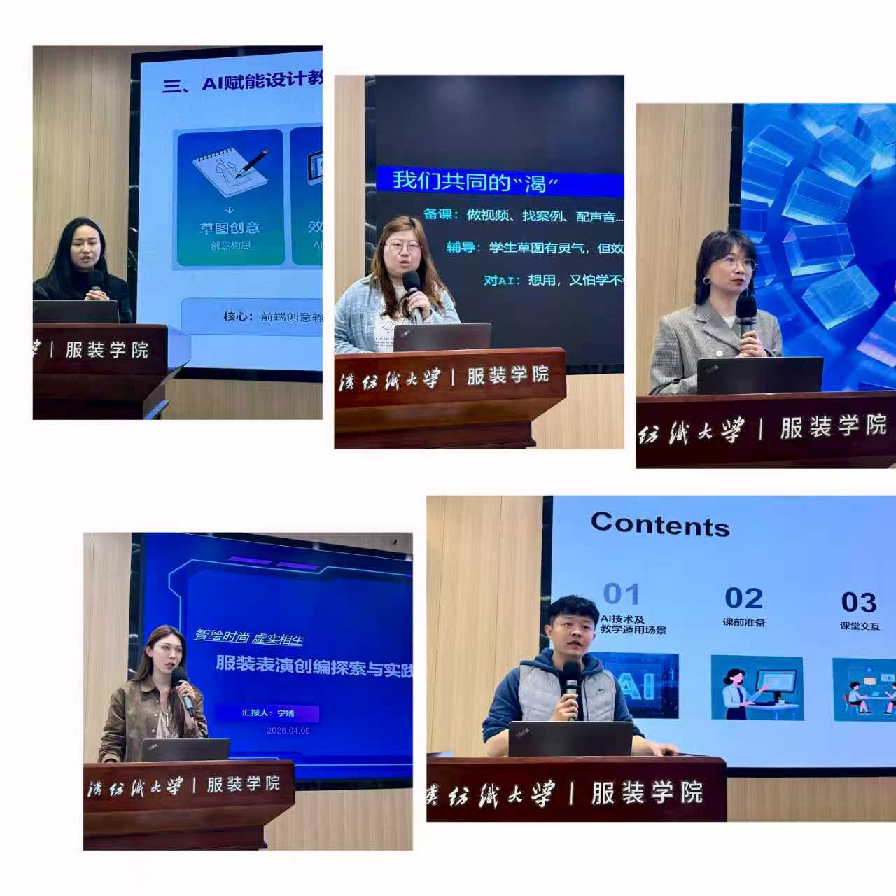 服装设计一系的张梦云老师围绕《AI赋能服装设计案例分享——从“手绘草图”到“成衣大片”实践》对AI融入设计过程和评估进行实践。服装设计二系的郭梦娜老师围绕《AI赋能教学-不炫技,只解渴》探讨了自己在课程建设中如何运用AI辅助进行教学设计的体会。服装设计三系的周奕以《人工智能赋能视角下就业指导课的应用探索与实践路径》为题,通过运用AI评估和指导学生成功就业的真实案例进行分享。表演系的宁婧老师以《智绘时尚 虚实相生:服装表演创编探索与实践》为题,分享了自己在专业实践和创编策划方面的体会。服装设计与工程系的迟诚老师围绕《AI不释手:服装设计与工程专业教学过程轻量化》,分享了自己在教学和科研上运用不同AI途径的体会和经验。