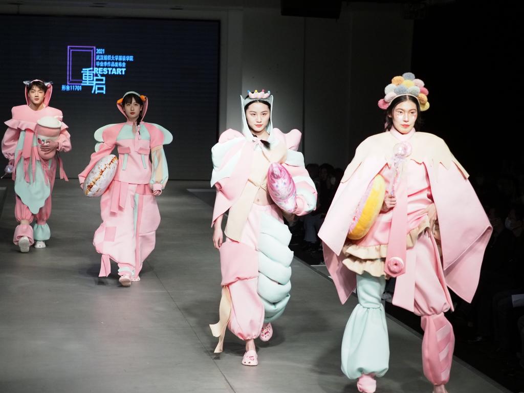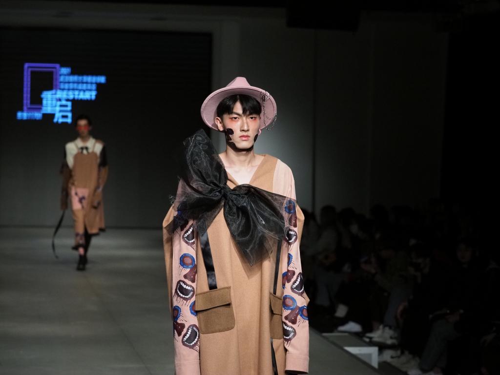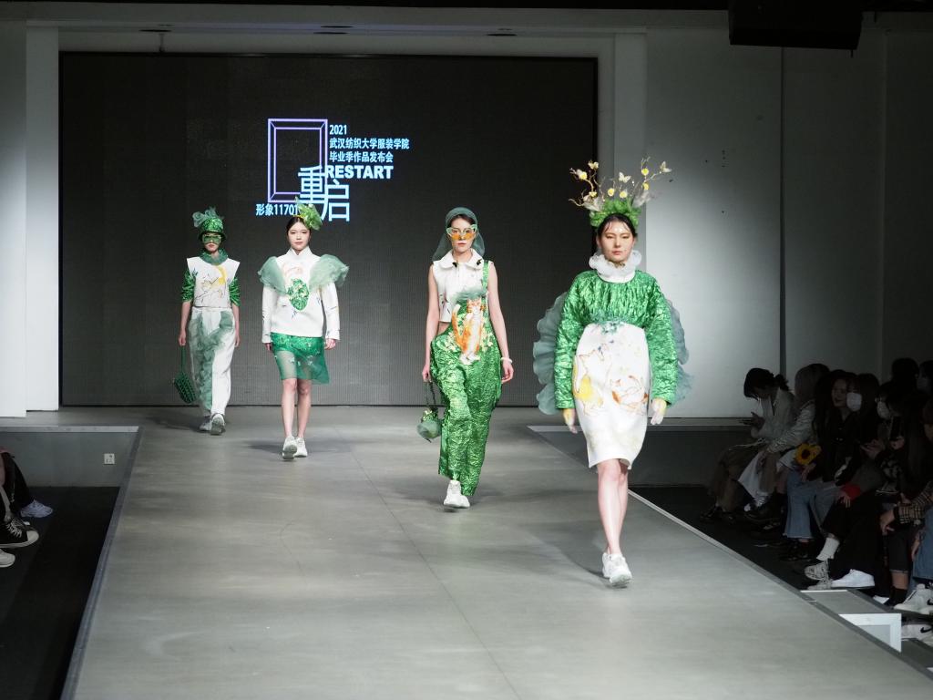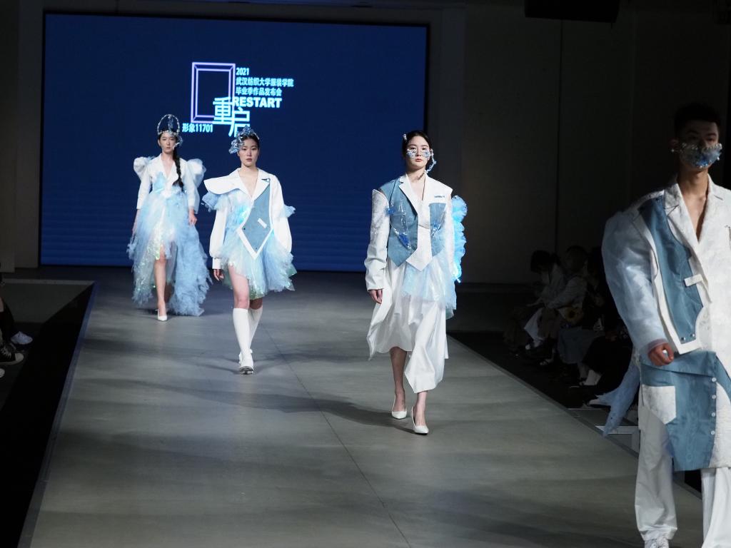 开幕式后,由形象设计11701班的毕业生带来题为“重启”的开场首秀。设计灵感源于疫情之后服装行业与时尚产业的复苏与重启,不仅表达了设计师对当下时尚的解读和重构,更是对疫情期间,全国各地驰援湖北、驰援武汉无私大爱的致敬。