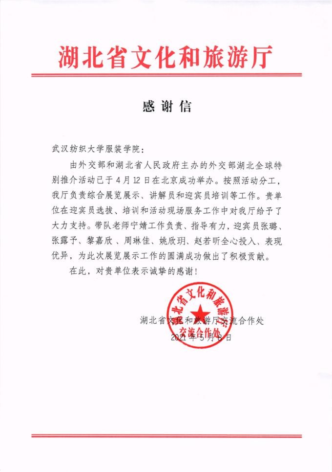发来感谢信,感谢学院在外交部湖北全球推介活动作出的贡献。