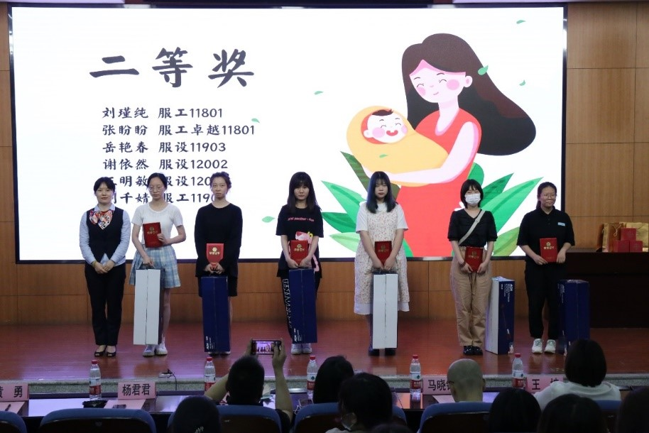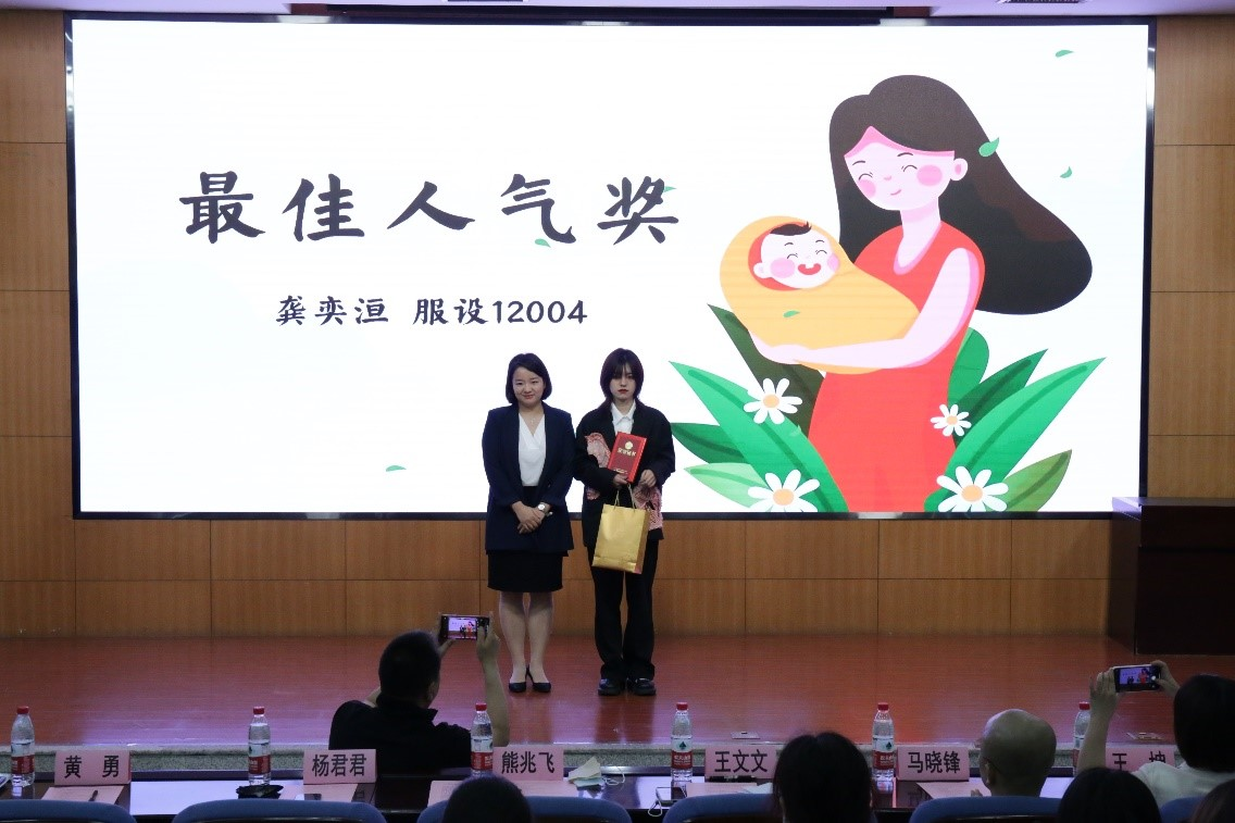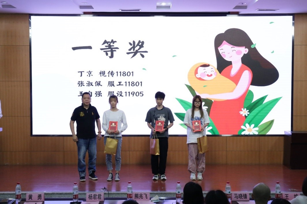 颁奖环节,主持人宣布本次比赛的一、二、三等奖,以及“学团小微”微信公众号线上投票产生的“最佳人气奖”。获奖同学代表施菲婷、宋雨菲、王自强分别分享了他们和母亲的故事、创作心得和设计灵感。