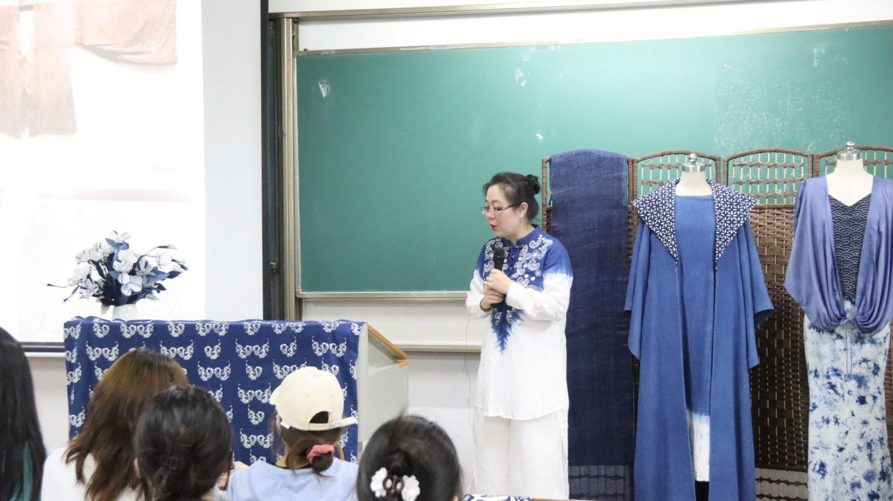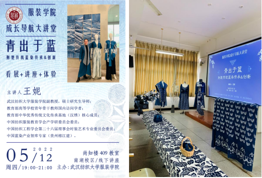 成长导航大讲堂——“青出于蓝”沉浸式展览讲座在尚知楼409教室举办。教室内一片蓝白相间的蓝染服装与服饰设计作品,仿佛让我们置身于蓝色的海洋一般。身处在纺大染语师生团队精心布置的教室里享受着传统印染技艺之美。众所周知“青出于蓝”的喻义,但很少人了解是出自于战国时期《荀子·劝学》开篇中“青,取之于蓝,而青于蓝”。古人用靛蓝染布的过程来教导弟子学习永远没有止境,希望弟子们能够坚持不懈地努力学习。
