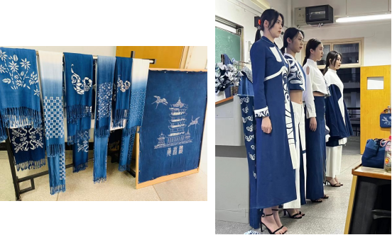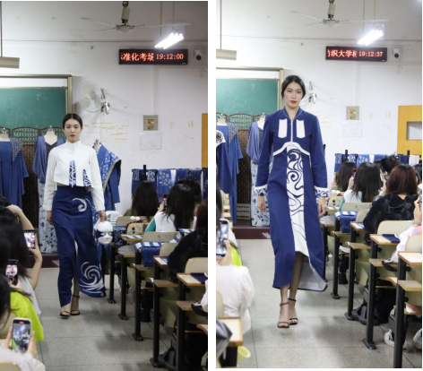 现场所展示的蓝染服饰正是上述国家级和省部级参展作品,也让在坐同学们大饱了眼福,感受到手作染色的魅力。在这次讲座开始前,四位模特身着蓝染服装进行了现场三分钟走秀展示,让在坐的同学们都感受到了充满特色的扎染和蓝印花布艺术,沉浸在传统印染创新服饰的美感之中。