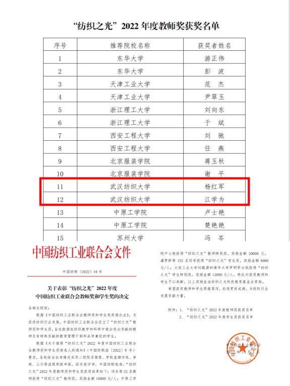 2022年是“纺织之光”教师奖开设25周年。日前,“纺织之光”2022年度中国纺织工业联合会教师奖和学生奖评审会在大连工业大学顺利召开。我院副院长江学为获“纺织之光”教师奖。