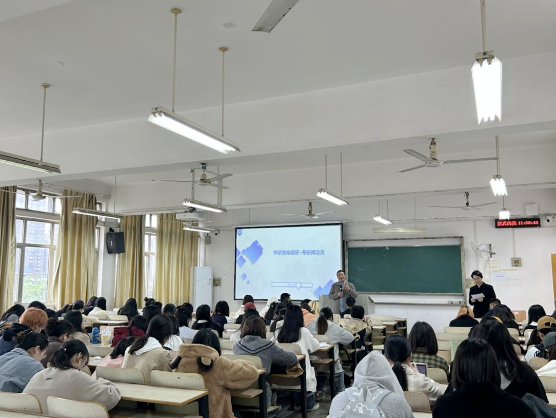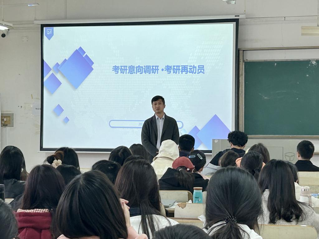 郭泰辰作动员讲话。他谈到,动员会是起点,希望大家树立远大志向,沉下心来备考,并振作起来为之奋斗,学院会积极为大家解决备考、就业中的问题,为提高大家考研、就业做好服务,推动高水平考研高质量就业工作。希望大家通过自己的努力,为下一届学子树立榜样。