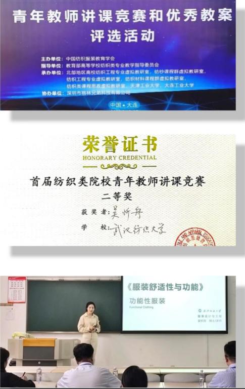 我院服装设计与工程专业青年教师吴忻舟博士主讲的《服装舒适性与功能》将思政教育与专业教育紧密融合,精心构思教学设计,创新教学方法,重塑教学模式等。最终,经过激烈角逐脱颖而出,荣获二等奖。