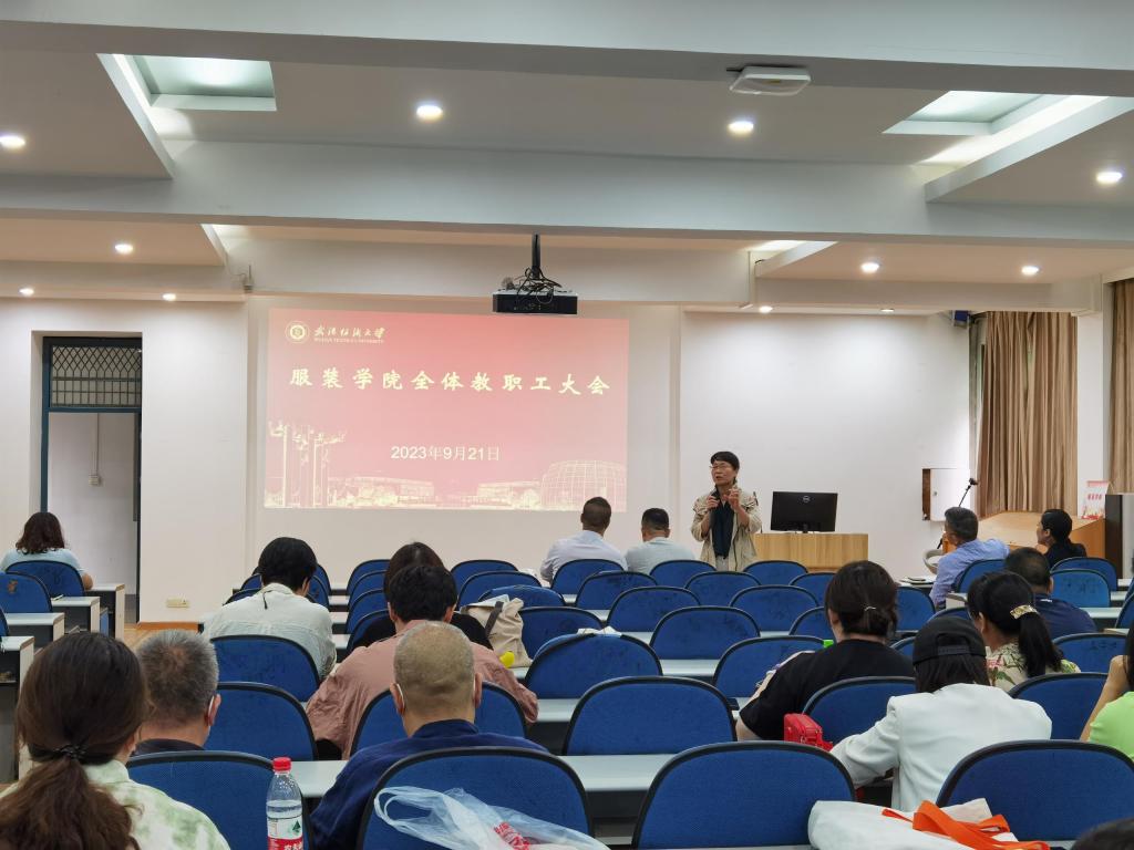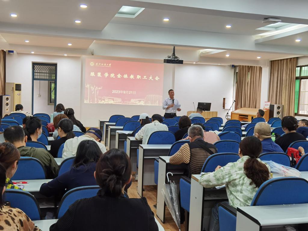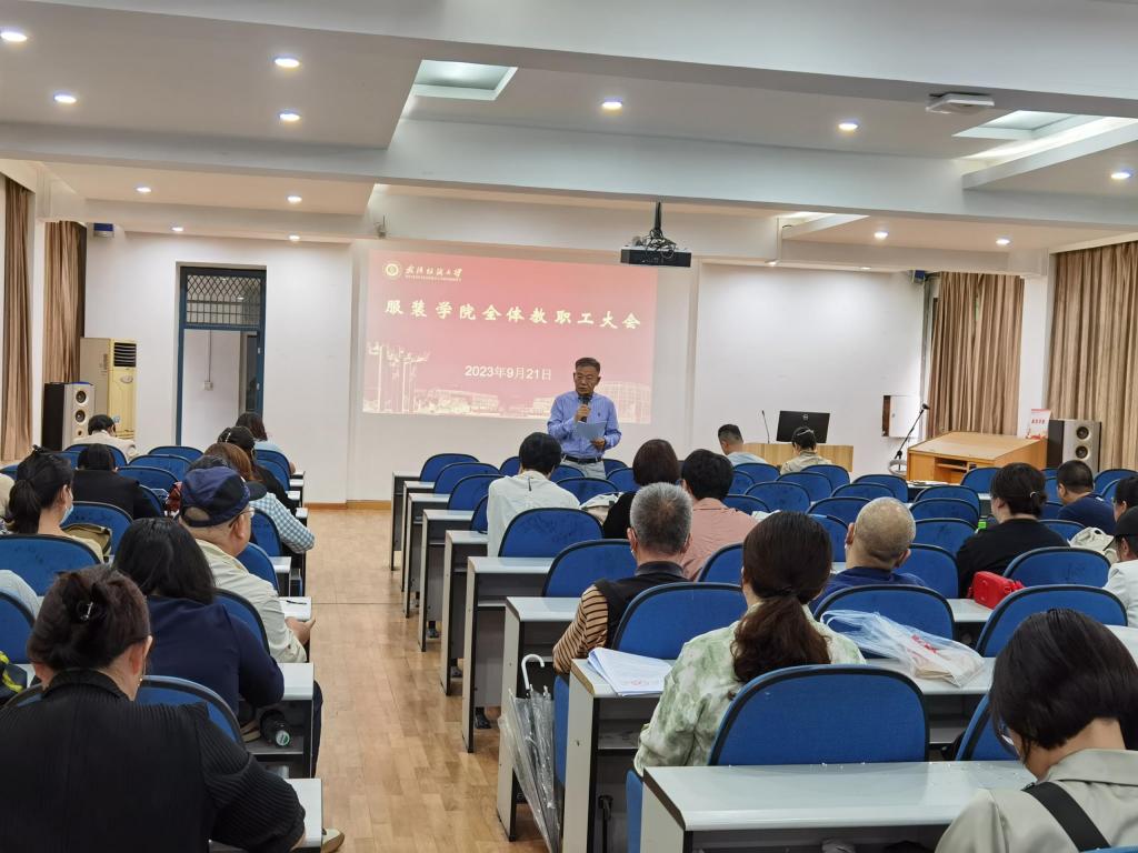 在服装艺术楼二楼学术报告厅召开全体教职工大会,重点传达学校本科教育教学审核评估培训部署会精神,会议由杜新年书记主持。