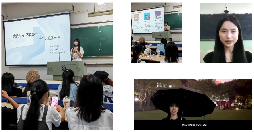 研究生的蒋礼香、考入上海戏剧学院研究生刘子彦学姐通过她们精心制作的励志视频向现场的学弟学妹传经送宝,鼓励大家积极备战考研。优秀在校生代表大四学生刘晓雨和大三学生付芷璘同学,从自身学习经历出发,对新生们提出了建议:不仅要从课堂上汲取知识,还应尽早明确学习目标、端正学习态度、持之以恒、积极参加社会实践活动和学科竞赛,并指出应在各个年级明确学习重点,对专业学习和自我发展进行合理规划,精准努力。