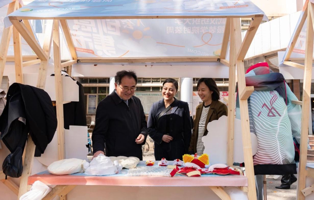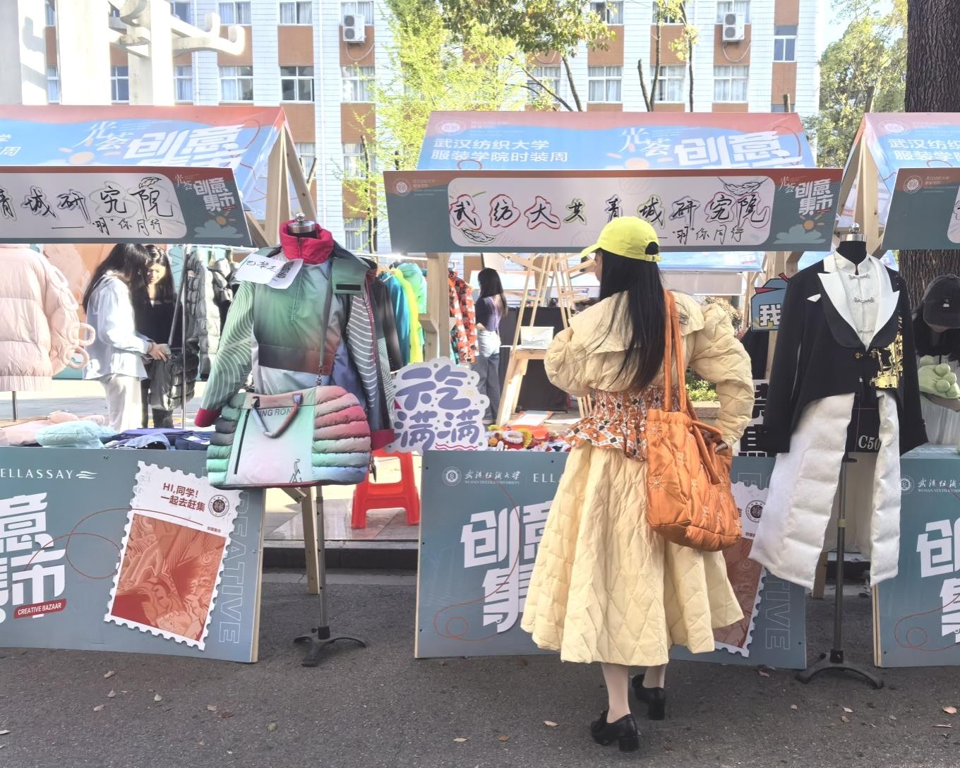 这个摊位是由本科生和研究生共建的团队,她们积极将自己设计源动力融入美好纺大的建设中,主动关注崇真尚美的校训努力践行创新实践,在2023年国家级大创项目支持下,以我校纺织科技助力航天强国为理念,提取中国传统飞飞行文化的缠枝蝙蝠纹、苍穹之花、楚凤等吉祥纹饰集合宇航员元素设计原创丝巾。领带则围绕学校文化IP的形象延伸品为思路,设计以学校logo为核心的系列领带。在创意集市完成了“作品”到“产品”的转换,这些代表纺大特色文创产品得到中南干训班领导学员们的青睐,纷纷扫码现场购买或定制。还有周边高校的老师也在闲逛中定制了多条设计新颖独一无二的真丝丝巾,不到一天销售流水已经过千,对同学们的创新精神和设计能力给与支持和肯定。