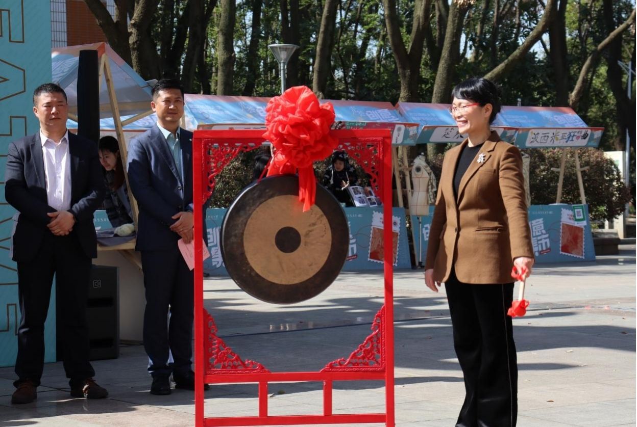 院长陶辉教授为创意集市敲响吉祥的锣声,学生工作部(处)、校团委、创新创业学院等相关职能部门领导,百合小说