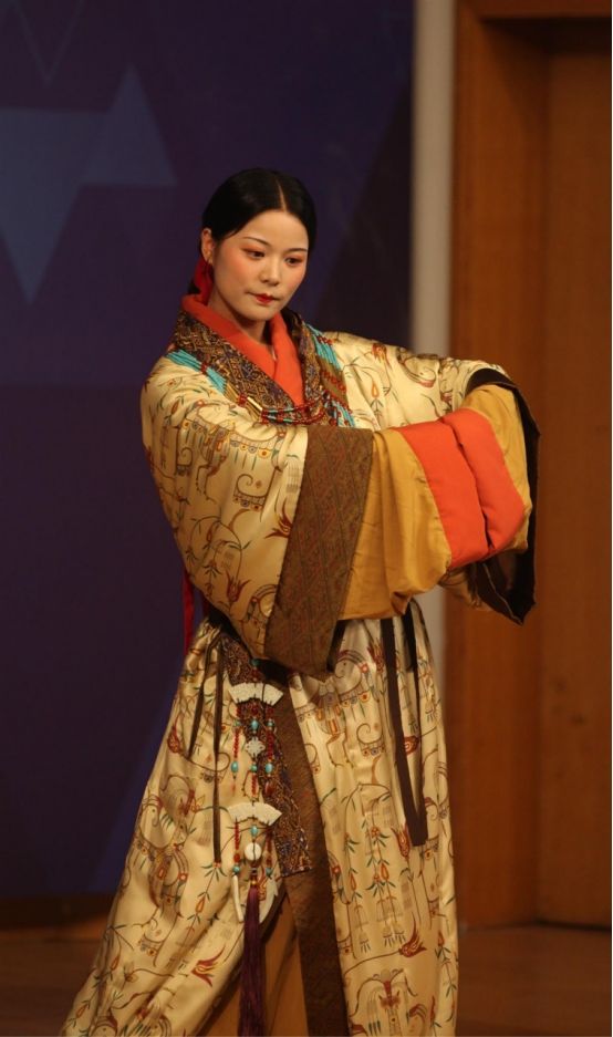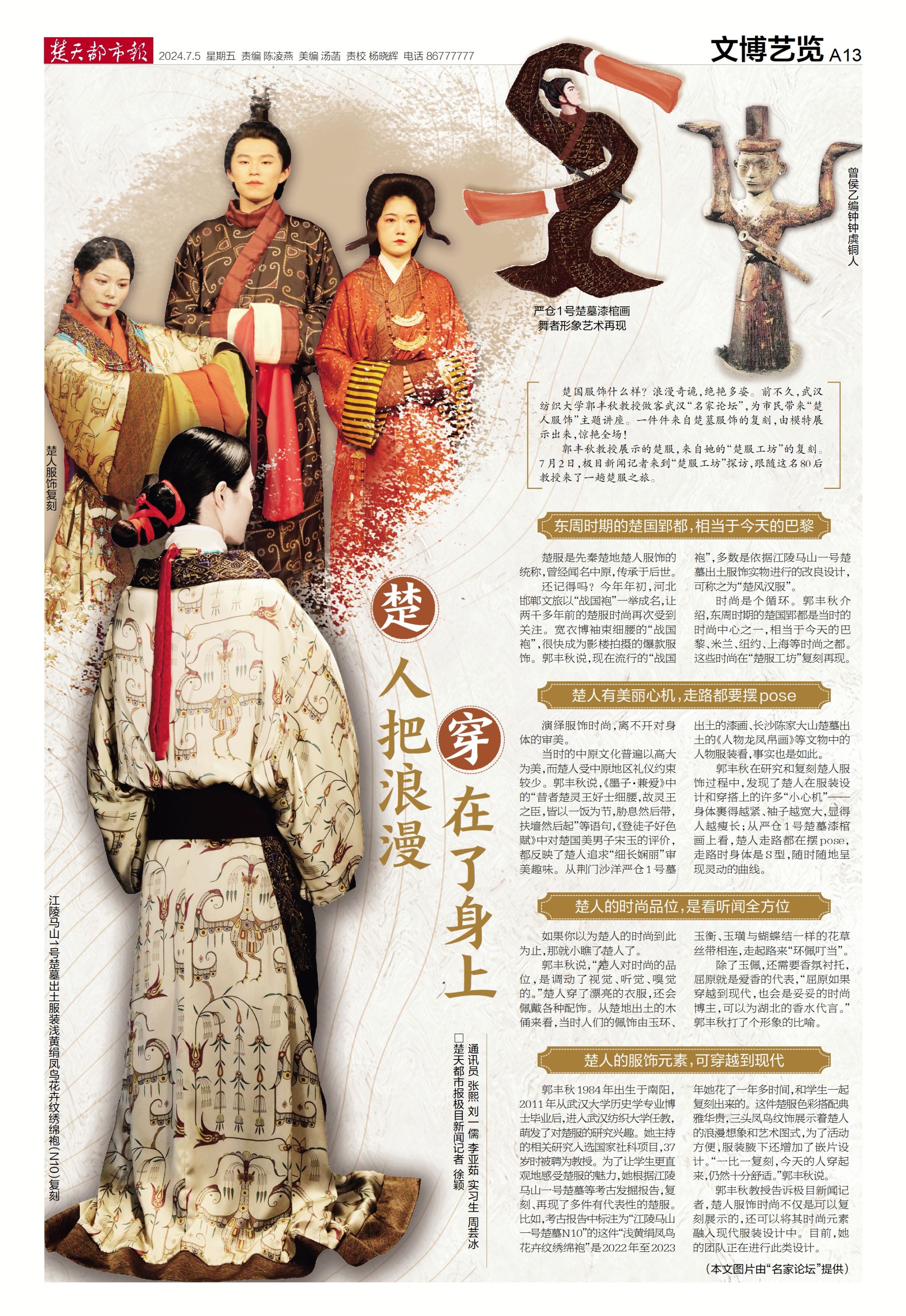 任教,萌发了对楚服的研究兴趣。她主持的相关研究入选国家社科项目,37岁时被聘为教授。为了让学生更直观地感受楚服的魅力,她根据江陵马山一号楚墓等考古发掘报告,复刻、再现了多件有代表性的楚服,比如,考古报告中标注为“江陵马!号楚墓N10”的这件“浅黄绢凤鸟花卉纹绣绵袍”是2022年至2023年她花了一年多时间,和学生一起复刻出来的。这件楚服色彩搭配典雅华贵,三头凤鸟纹饰展示着楚人的浪漫想象和艺术图式,为了活动方便,服装腋下还增加了嵌片设计。“一比一复刻,今天的人穿起来,仍然十分舒适。”郭丰秋说。