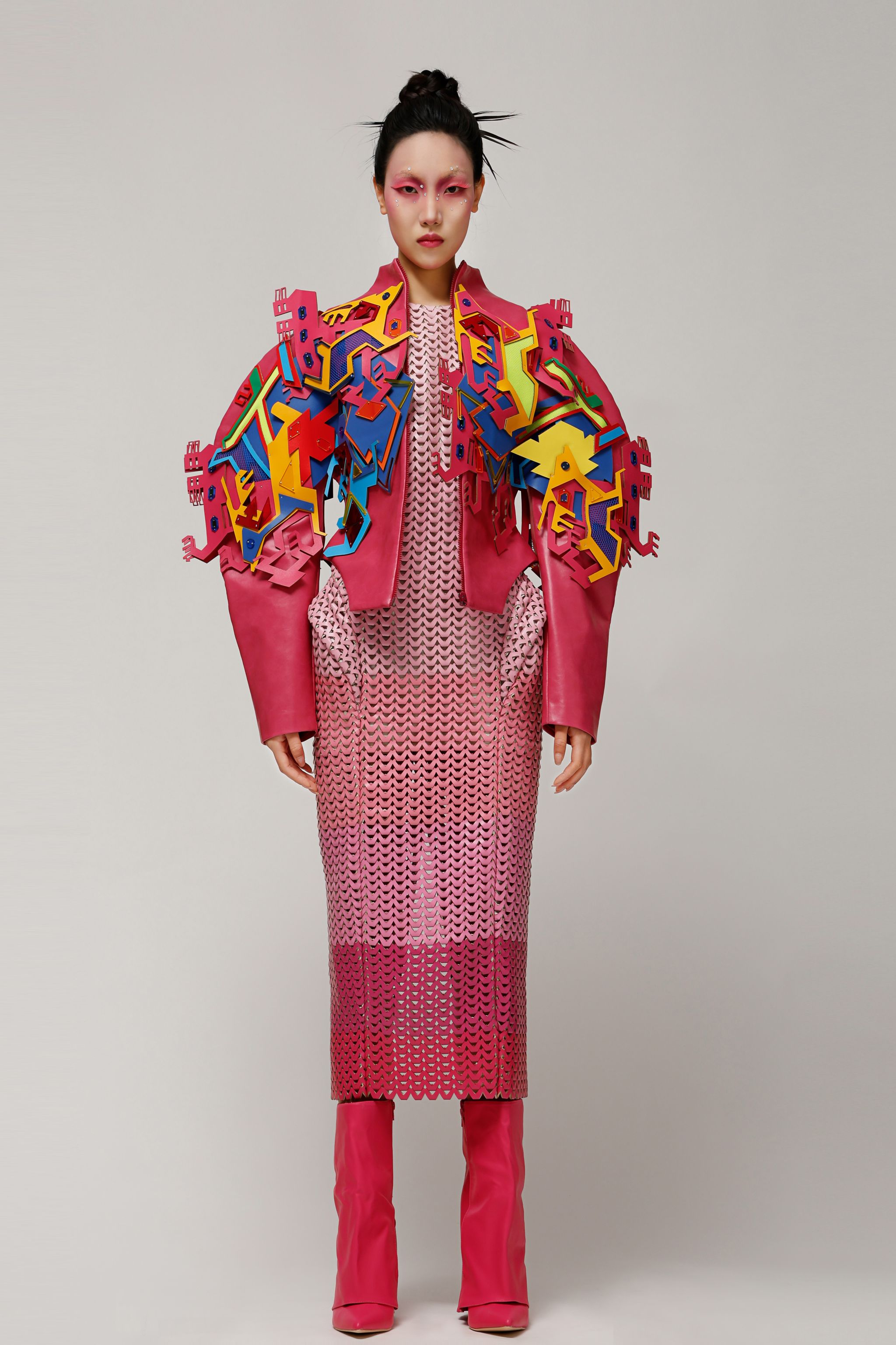 作品《无声的交响》以长江文化为出发点,融合当代审美,通过色彩渐变和多种颜色的混搭与碰撞,构建出一幅生动而深刻的视觉叙事画面。运用激光雕刻、手工编织、叠加堆积等多样化的工艺手法,将传统服饰元素中的楚国纹样进行解构与重组,赋予了服装独特的气质与形态。作品旨在探索一种超越传统界限的艺术表达,将自然界的微妙之音转化为可视可感的时尚语言,表达一种轻松自在的生活态度和对美好生活的憧憬与向往。