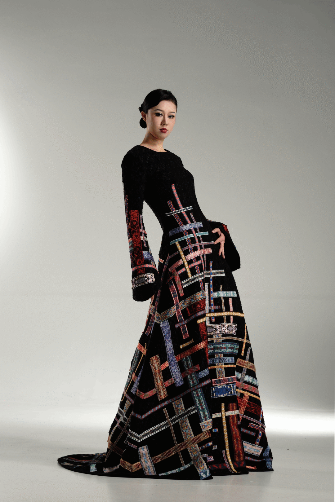 融合的一瞬间是个体对生命哲学的注解。所彰显出来的价值理想是对服装作品的不断雕琢,追求完美并不断地挑战自我。在这样的价值理想中,既有对作品的精益求精,还有对过程的一丝不苟甚至苛求,以及对作品发自内心的热爱。只有在作品制作过程中才能看见,本人以我国少数民族服饰特点中的织带为设计点,以技艺本身的发展为根本,内核部分为工艺流程与技艺,具体的工艺流程与技艺通过积累与提升。达到“严谨专注、注重细节、精益求精”的融合境界。