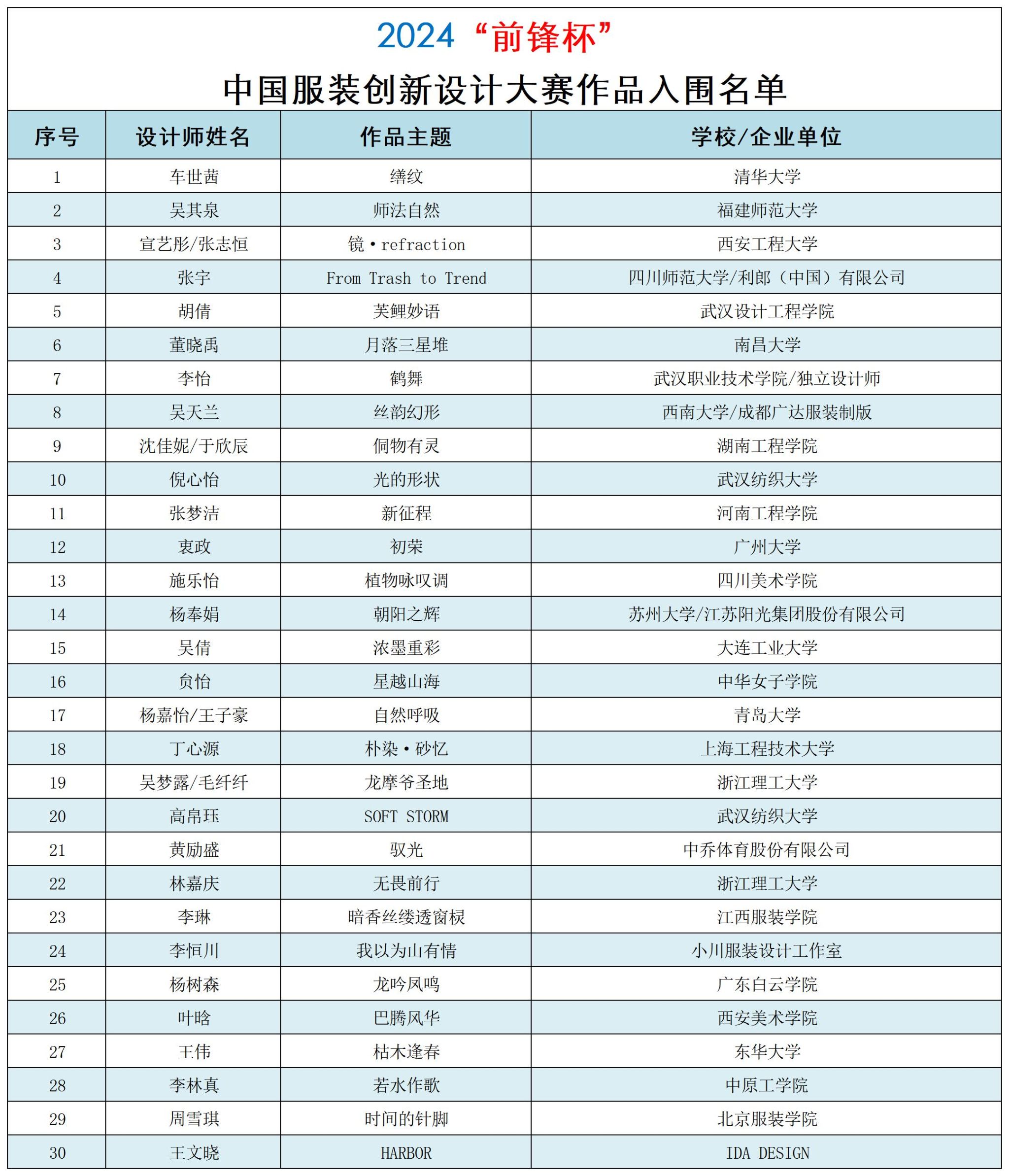 、广东白云学院、武汉职业技术学院、闽南理工学院等60多所专业院校以及中乔体育股份有限公司、利郎(中国)有限公司等10多个服装企业与独立设计师。这些作品从不同角度对主题进行了诠释,体现设计师的独特视角和对中国服装产业的理解。