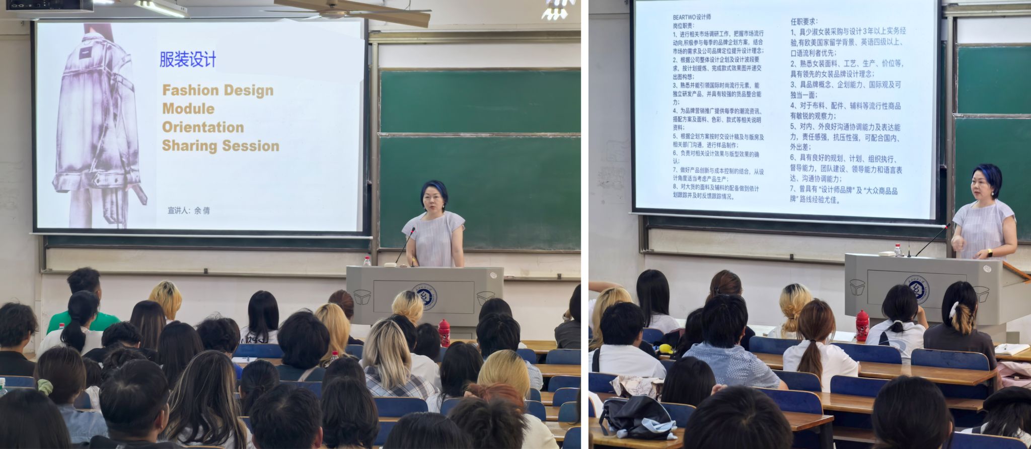 全国十佳设计师余倩老师为新生传经送宝,就大学四年的学习生活规划,和本专业和行业的职位需求进行了详细说明,引导学生提前了解就业方向和职位类别和要求。通过多位优秀毕业生职业发展案例,生动地向新生展示服装领域地就业前景。最后,余老师寄语大家,服装设计学习是一个长期坚持的过程,需要自律和努力,更需要提前规划,利用课余时间丰富专业实践更是提升综合素养的法宝。