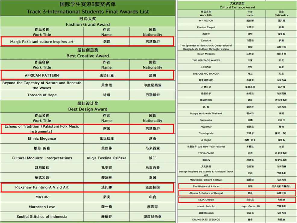 巴基斯坦籍留学生 Muhammad Abdullah Sarim Ansari(剑锋)的设计以 "Manji: 巴基斯坦文化激发艺术灵感 "主题;来自加纳的留学生 Fatahiya Tijani (法塔什亚) 的设计获得了以 "非洲图案 "为主题的 "最佳创意奖";2 名留学生 Muhammad Ahmad (阿米) 和 Sheikh Farzana Akter (法扎娜) 获选 "最佳设计奖"。此外,还有三名国际学生 Luiz Da Fonseca Angles Aixa Correia (康瑞)、Taofir Ibne Tas Shuvo (舒沃) 和 Florian Anthony Gezaho (安东尼) 入选 "文化交流奖"。除了百合小说
