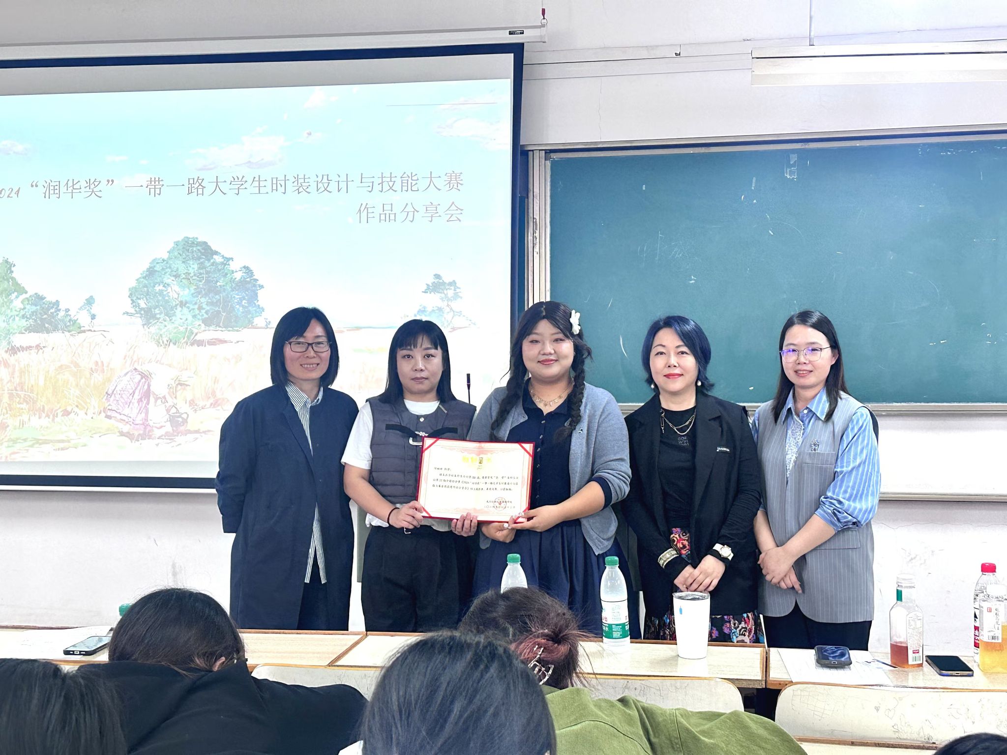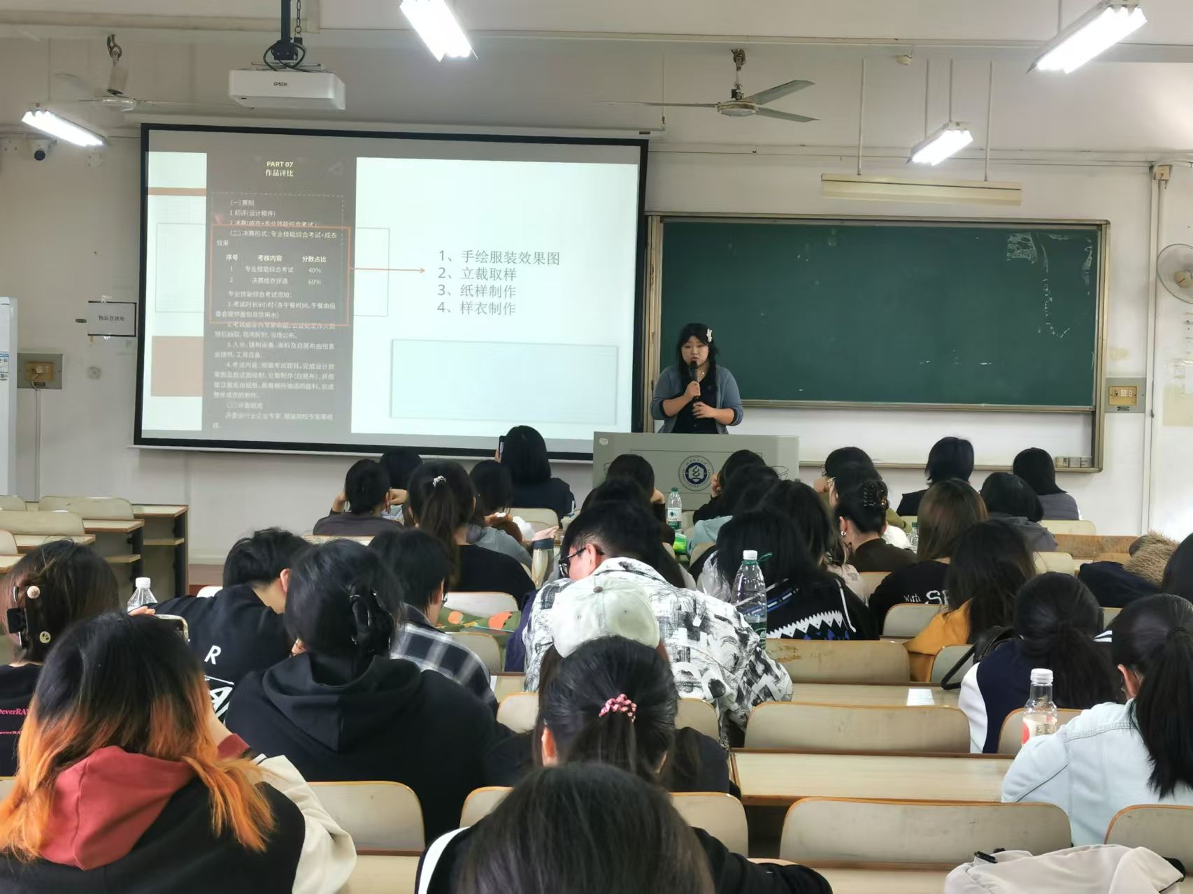 在分享会上,中日12102班的何婉婷同学真诚地和在场的每一个同学分享了2024“润华奖”一带一路大学生时装设计与技能大赛的参赛经验。分享内容主要是围绕五个方面:大赛前期准备、设计作品集制作、比赛的成衣制作、比赛的过程以及学校课程学习的重要性,同时还播放了精心剪辑的参赛过程视频。她分享道在成衣制作过程中如何选用和设计图更匹配的材质进行创新改造,并且现场展示了决赛服装的面料样片,讲述了羊毛混纺纱线以及水貂毛,双面呢无缝拼接针织并进行手工包边的复杂工艺,面料样片的精美和独特工艺令在场的所有同学啧啧称奇。