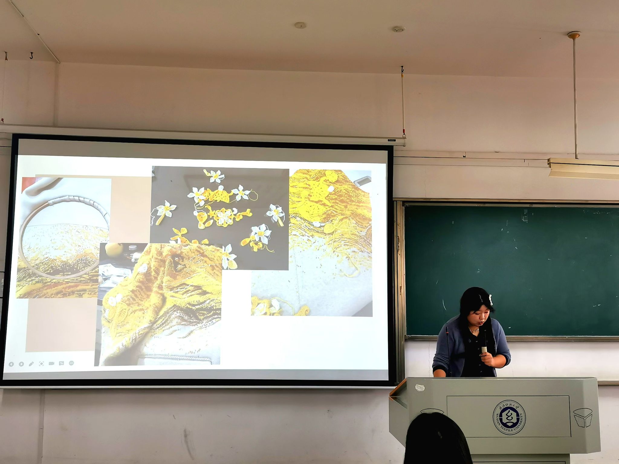 中日12102班何婉婷同学进行分享,2022级、2023级服装与服饰设计专业的本科生,乔丹老师、赵静老师和余倩老师参加了论坛,分享会由百合小说